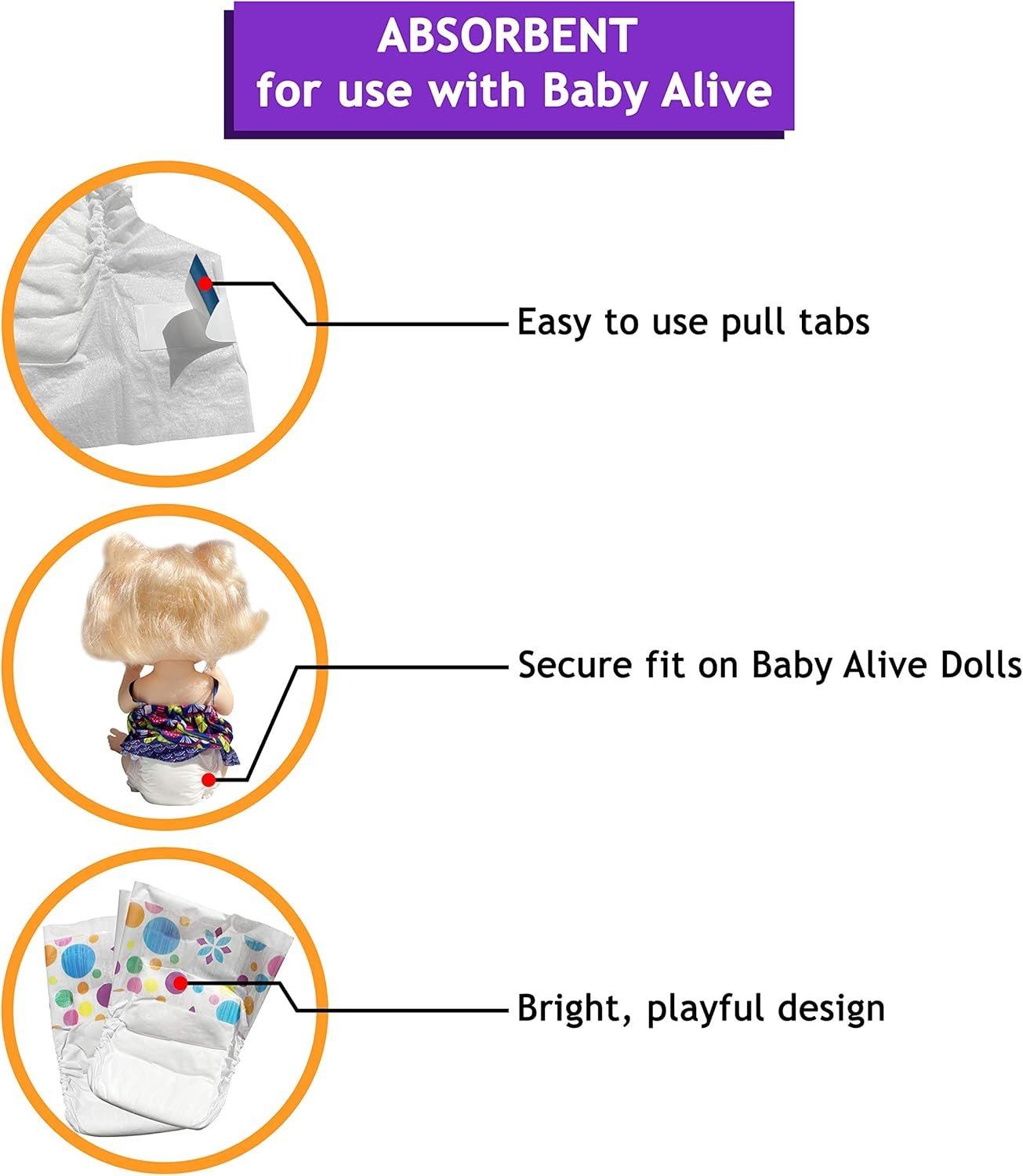 🌟 Quality, Absorbent Diapers: These diapers are just like baby’s, only smaller and adjusted to fit their Baby Alive dolls. The absorbent padding and snug fit keep any leakage contained.