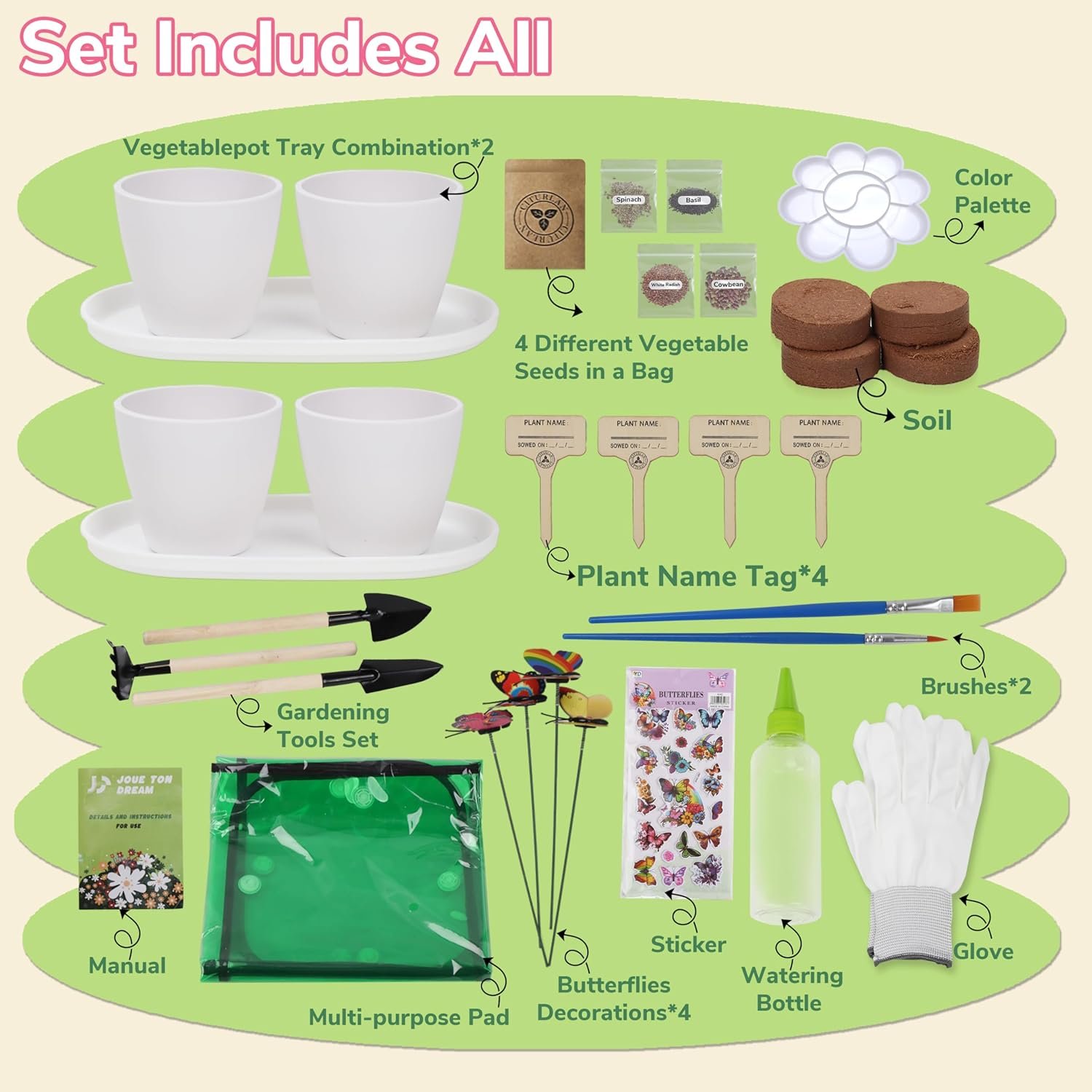 Kit Includes:This garden plant kit comes with a multi-functional mat and a pair of gloves. The mat protects the surface from dirt and stains while planting or decorating, and the gloves shield your hands during gardening, when transplanting plants. In addition, the kit includes4 pots,2 trays,4 types of seeds (Cowbean, Spinach, Basil, White Radish), soil, drawing tools,2 brushes, a palette,4 plant name tags, garden tools,4 butterfly decorations, stickers, a watering bottle, and instruction.