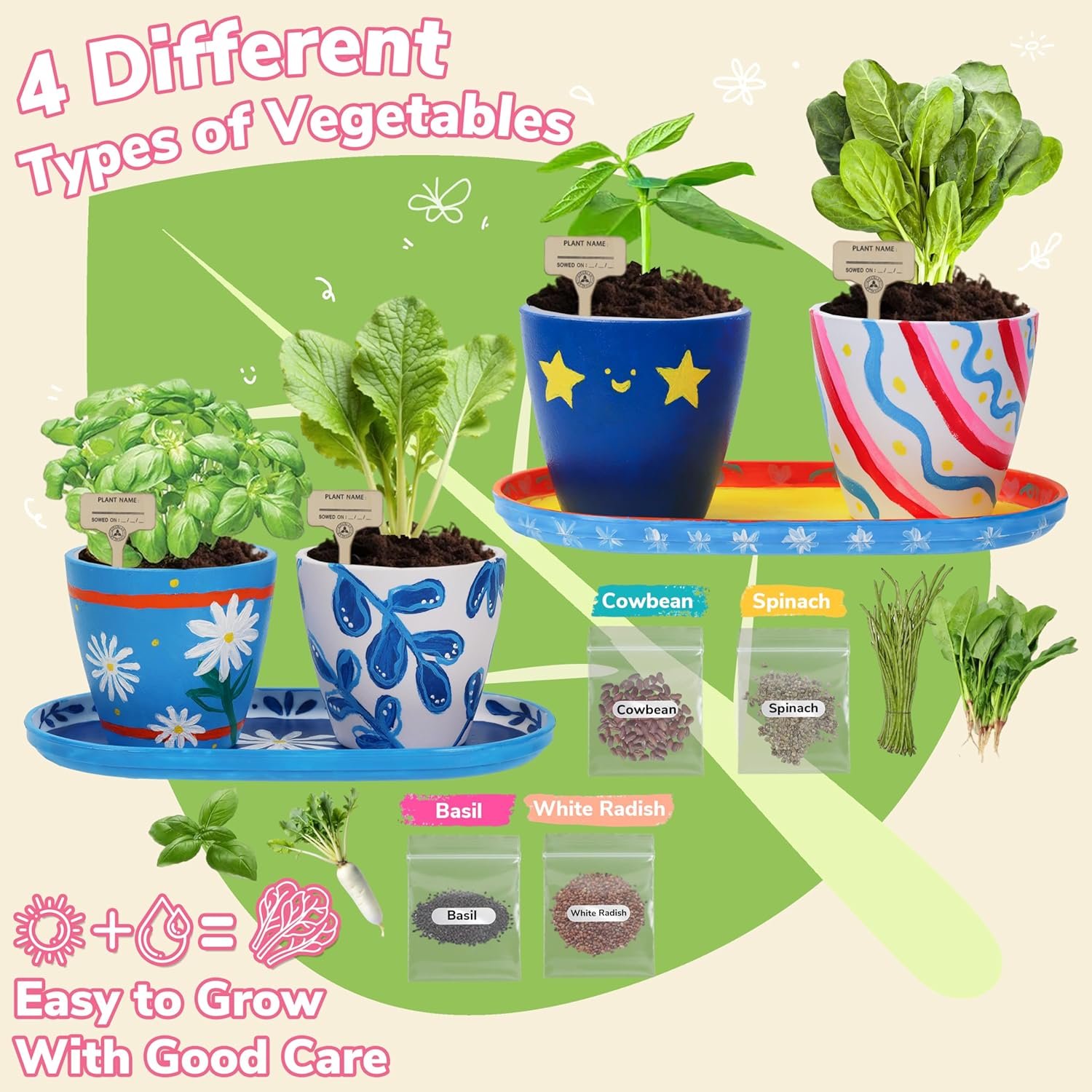 Unique Veggie Garden Experience:This kids gardening set provides a unique experience with vegetable seeds, sparking creativity and imagination. Instead of flowers, children will be excited to grow their own vegetables from seeds. They can decorate the pots with drawing tools, add decorations to create a truly unique vegetable garden. Each stroke of the brush will transform the pots into a reflection of their creativity, while the vegetable seeds will grow into something they can harvest and even taste.