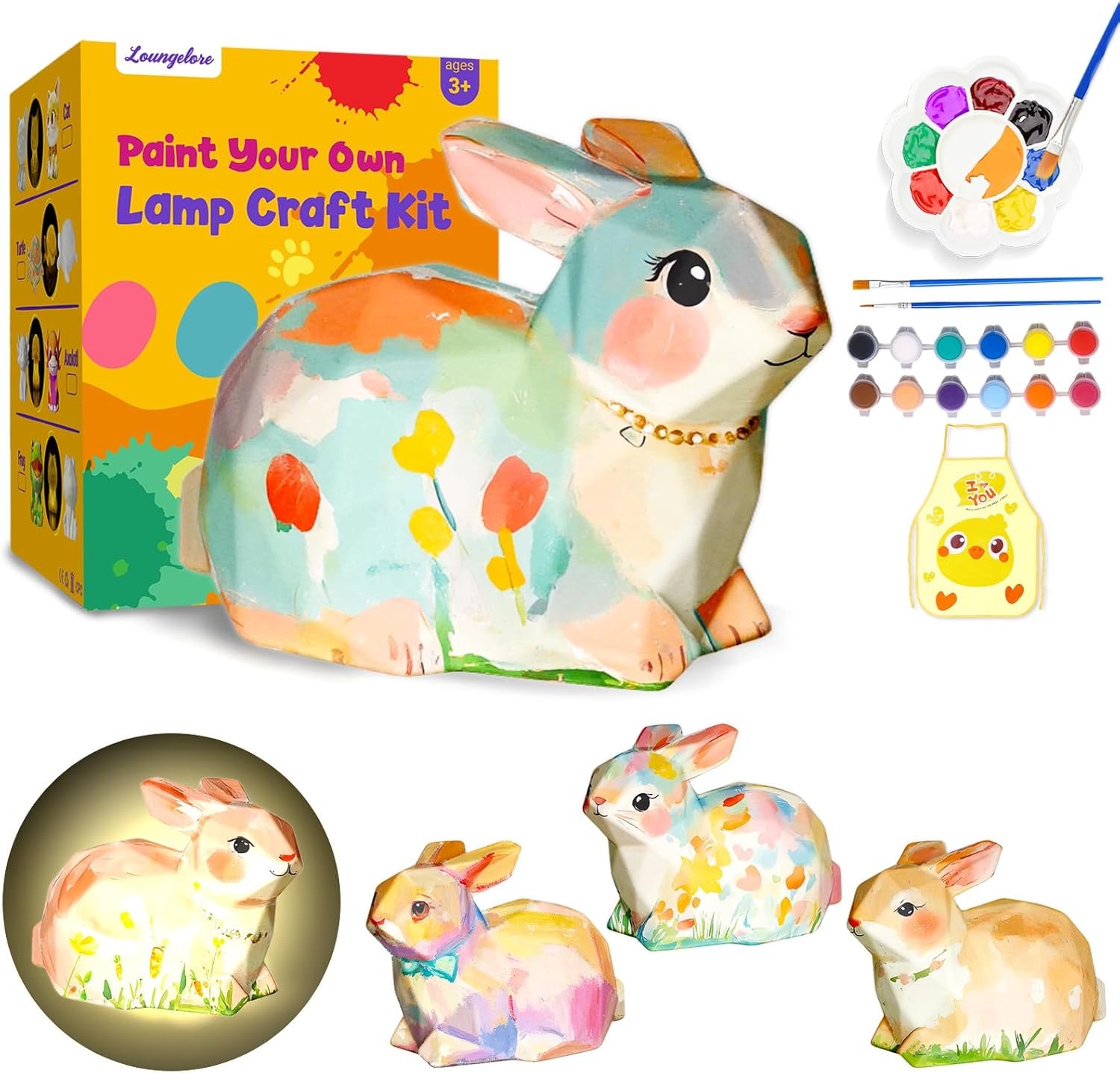 đ°ăCreate Your Own Bunny Lamp KităUnleash your creativity and paint your own Bunny LampďźThis all-in-one kit includes 1 unpainted Bunny lamp (equipped with battery), 2 brushes, a palette, 12 vibrant paint colors, and a protective apron. Perfect painting kit for kids, this kit promises hours of fun and creativity for arts and crafts for kids ages 8-12