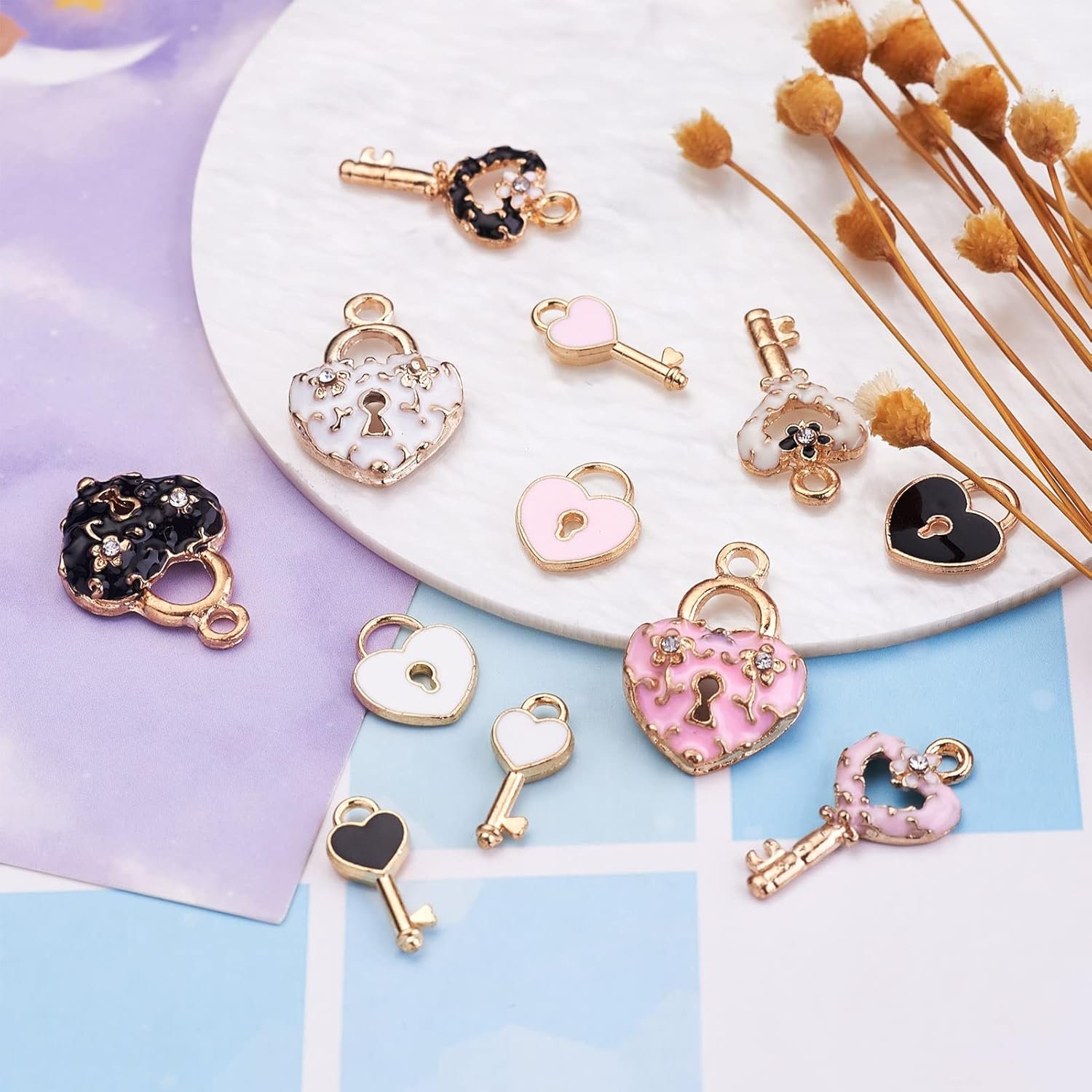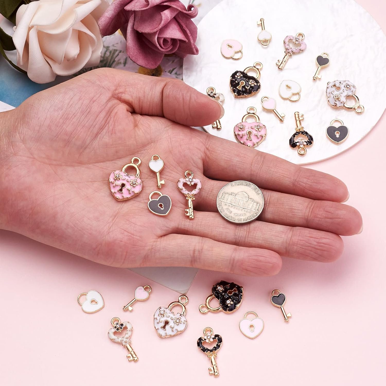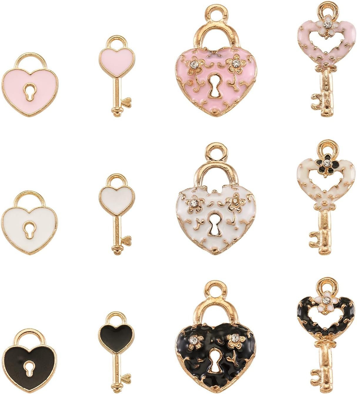 Pandahall 60pcs Heart Lock and Key Charms Mini Alloy Enamel Padlock & Heart Key Pendants with Rhinestone Light Gold Plated for Valentine’s Day Locked Bracelet Necklace Jewelry Making