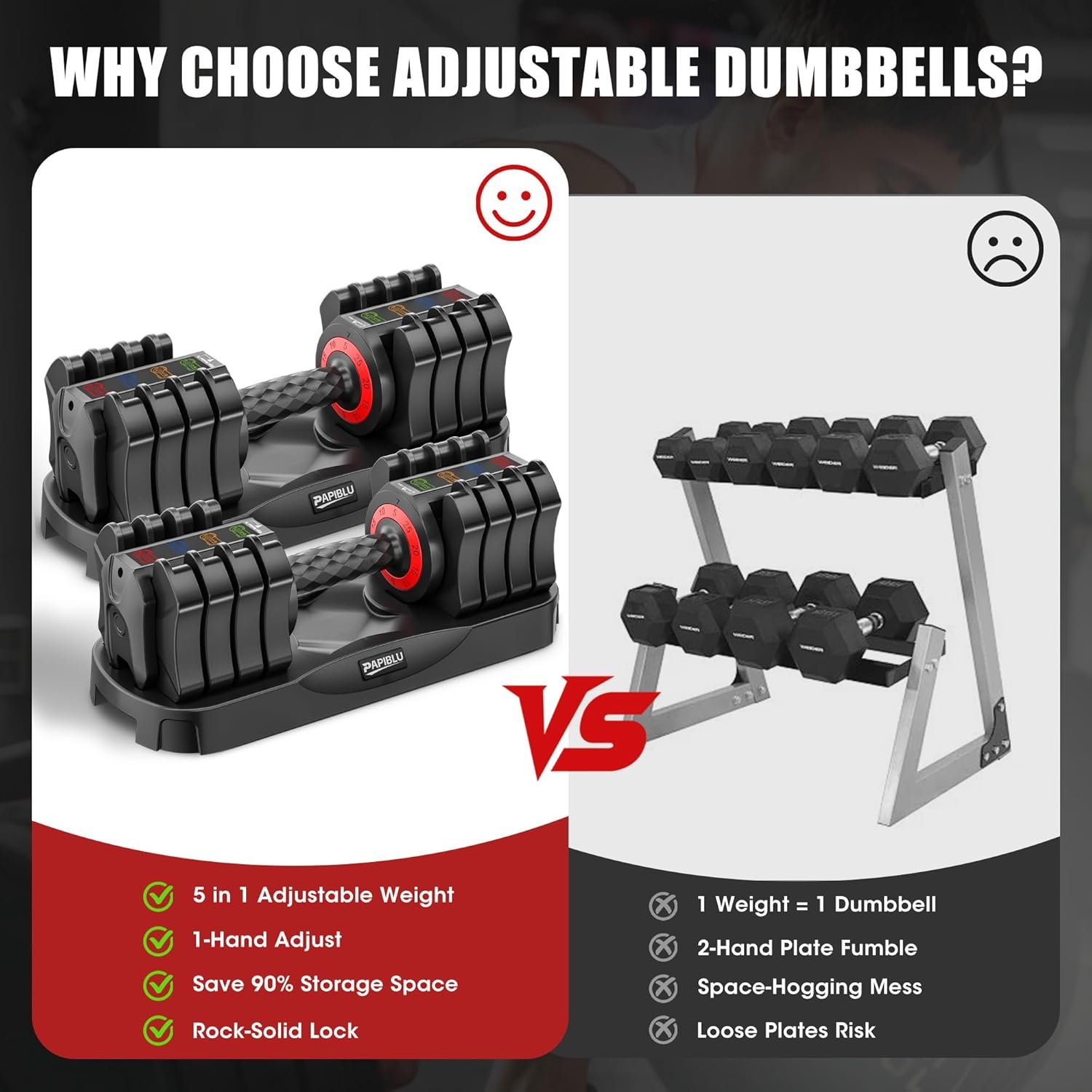【5-in-1 Adjustable Weight】This set includes 2 adjustable dumbbells, each offering 5 weight options (5LBS, 10LBS, 15LBS, 20LBS, 25LBS) to match every fitness level—beginners can start light for arm curls, while advanced users can go heavier for squats or lunges. It replaces 5 pairs of traditional dumbbells, covering all your full-body strength training needs at home.