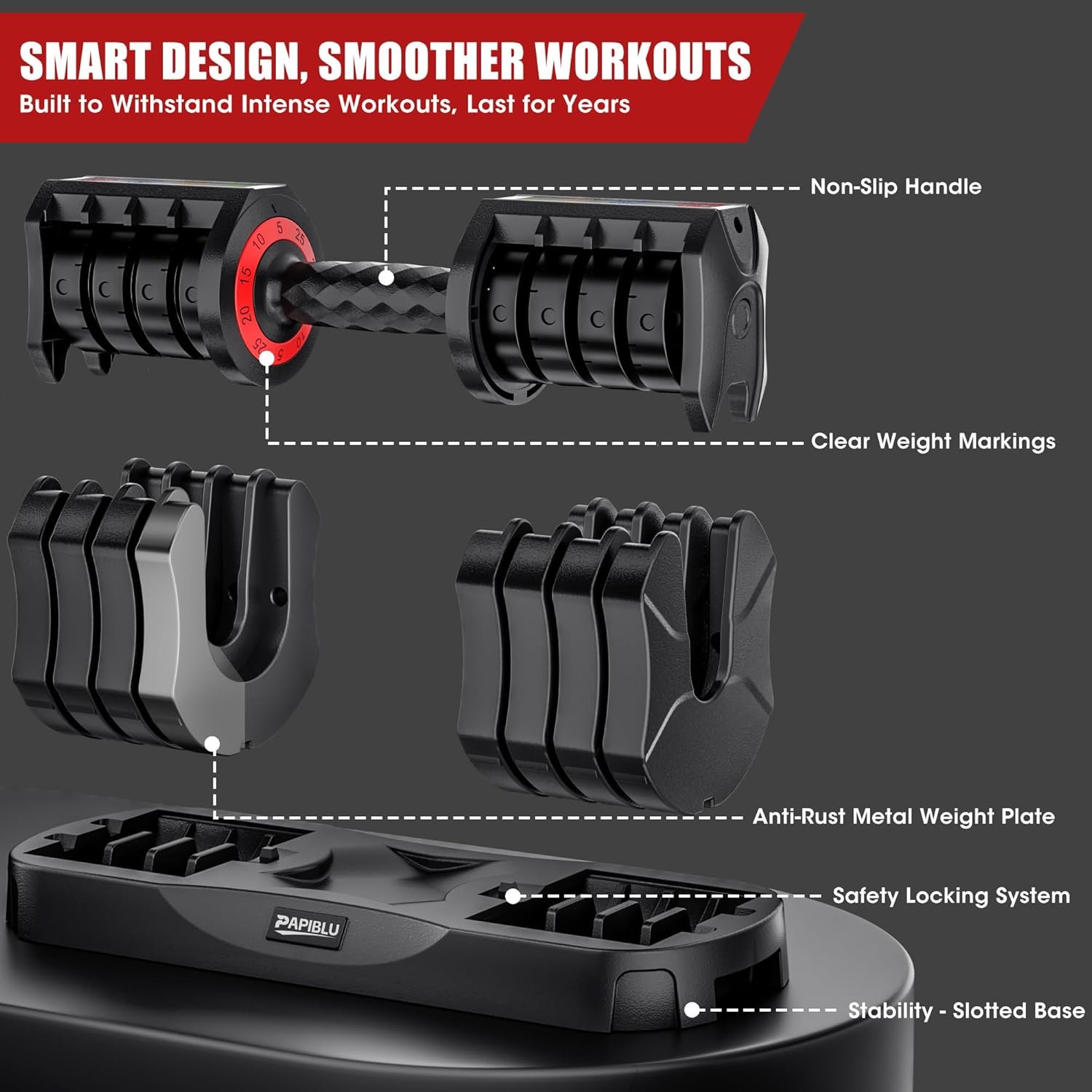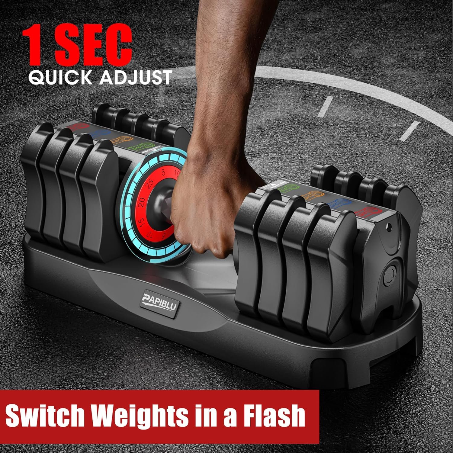 【1-Second Quick Weight Adjustment】No complicated disassembly or alignment—just twist the handle with one hand (while the dumbbell is on the base) to switch weights instantly. The smooth adjustment lets you transition between exercises (like from bicep curls to shoulder presses) without downtime, keeping your workout efficient and focused.