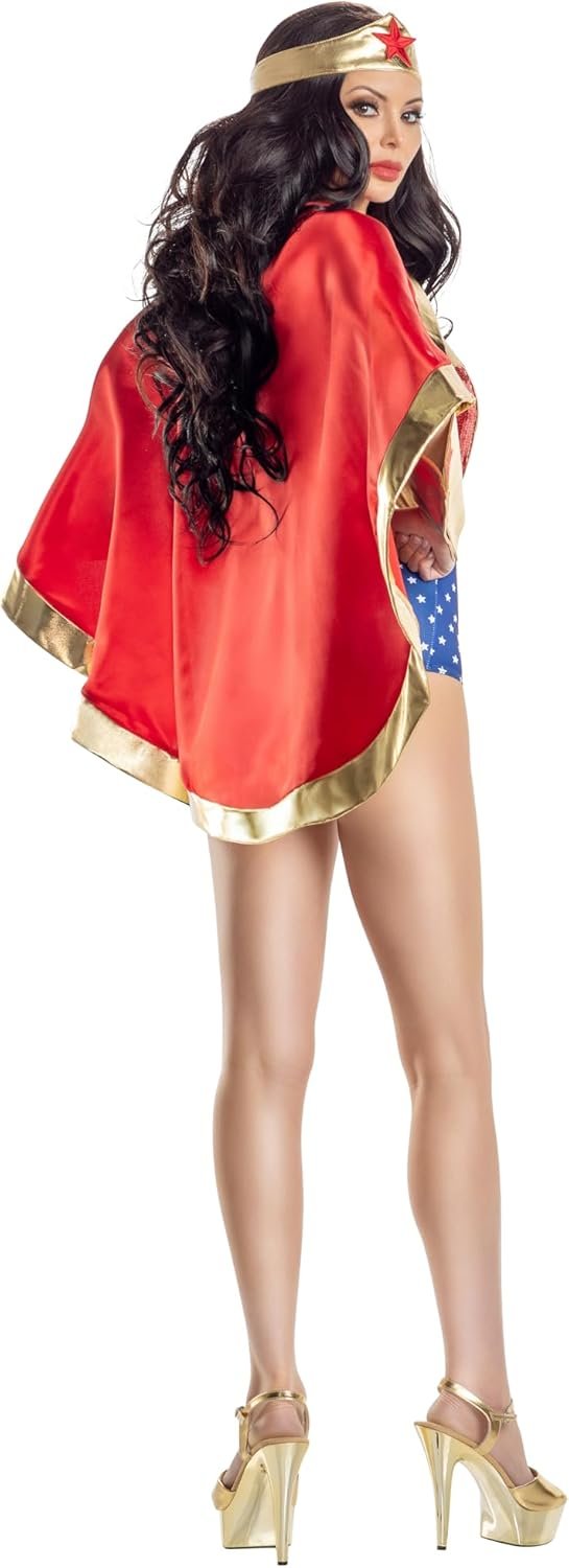 Wonderful heroine costume comes with wrist cuffs, headpiece and removable cape.