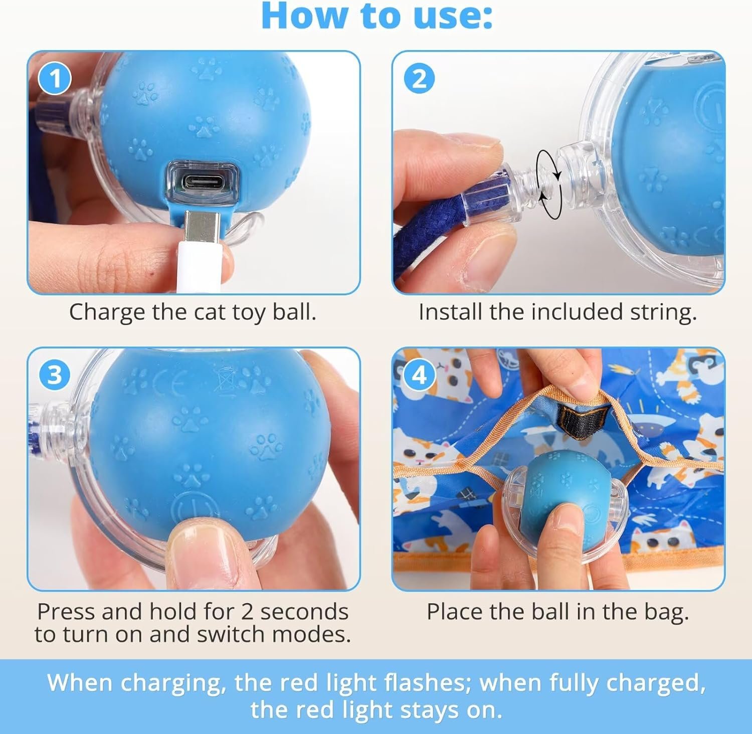 Motion-Activated & Rechargeable: The automatic cat toy ball is touch-activated and enters standby mode after 5 minutes of activity, but can be reactivated with a paw tap. USB rechargeable with LED indicators that flash while charging and stay solid when fully charged