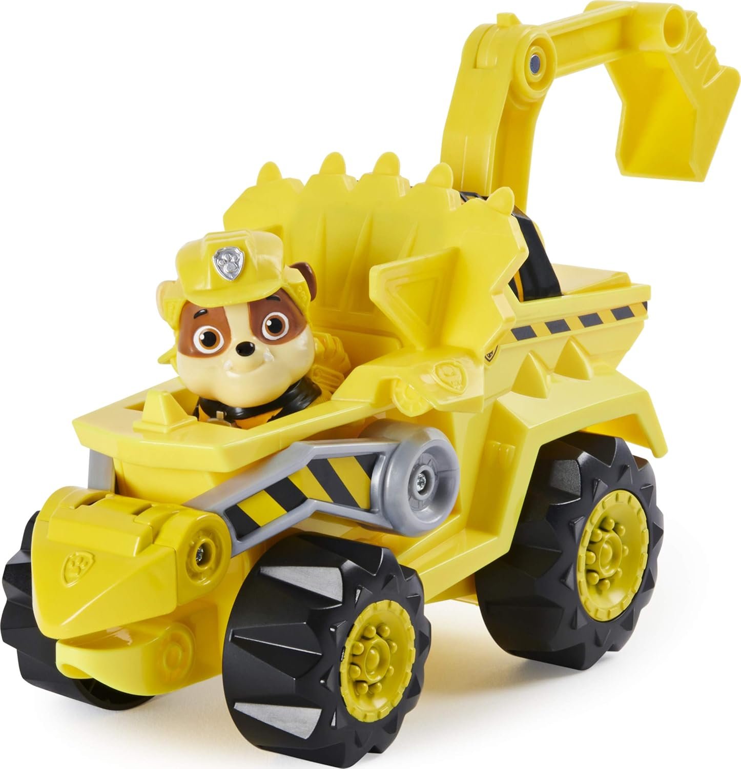 Go on exciting dino rescues with PAW Patrol’s Rubble and his Dino Rescue Deluxe Vehicle! This unique vehicle comes with Rubble and a mystery dino mini figure! Featuring dinosaur-inspired details, a working tool, a rev up motor and large wheels to conquer any terrain, Rubble’s rugged vehicle is ready to roll into action! Unbox the mystery figure from the packaging to discover a colorful dinosaur to use in all of your rescue adventures! When a dino friend is in trouble, place Rubble behind the wheel, rev the deluxe vehicle forward and watch it go! Explore your imagination to create awesome prehistoric rescues, just like the ones from the hit TV show. For more dino-sized fun, collect all of the PAW Patrol Dino Rescue Deluxe Vehicles (each sold separately) and load one into the Dino Patroller team vehicle (sold separately)! Rev up for rescue missions with Rubble and his Dino Rescue Deluxe Vehicle! Be sure to check out everyone’s favorite construction pup in Rubble and Crew!