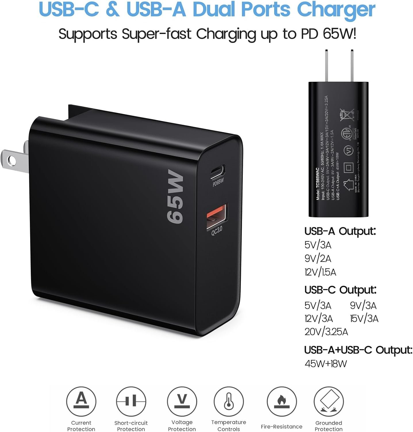 Black ABS wall charger, supports PD 65w fast-charging; Built-in smart IC chip-set to prevent short circuit, with over voltage and current protection