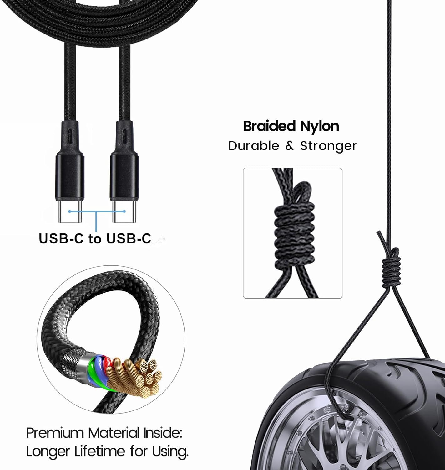 USB C to USB C cable, black, made up of braided nylon, steady and unbreakable; Supports quick charging; 6.6 feet / 2 meters long