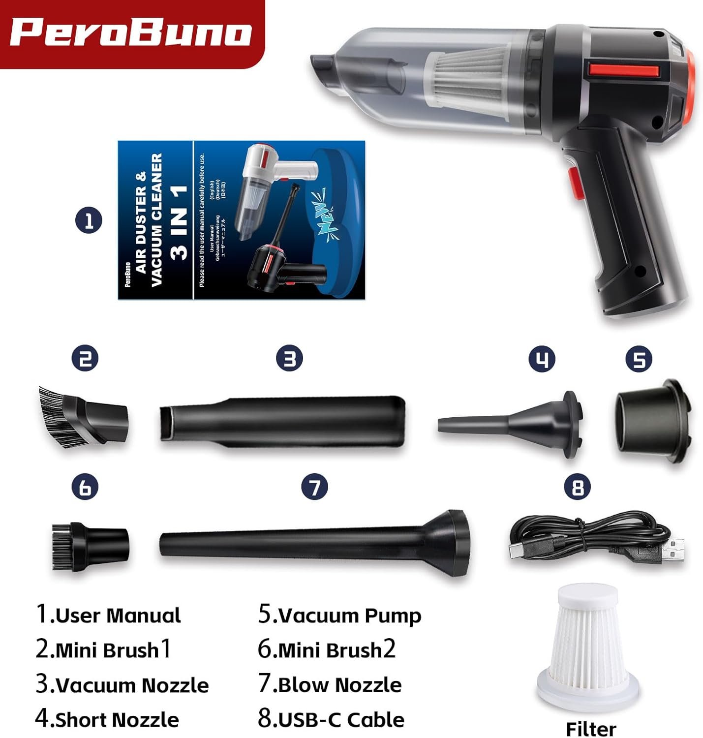 UPDATED AIR DUSTER: As an updated compressed air duster, there’s no more air leaks. You can also use this air duster to blow the dust away from computers with higher efficiency compared to other compressed air can dusters. PeroBuno keyboard cleaner adopted rechargeable battery and cordless design which is portable for you to clean desk, laptop, pc, computer and so on.