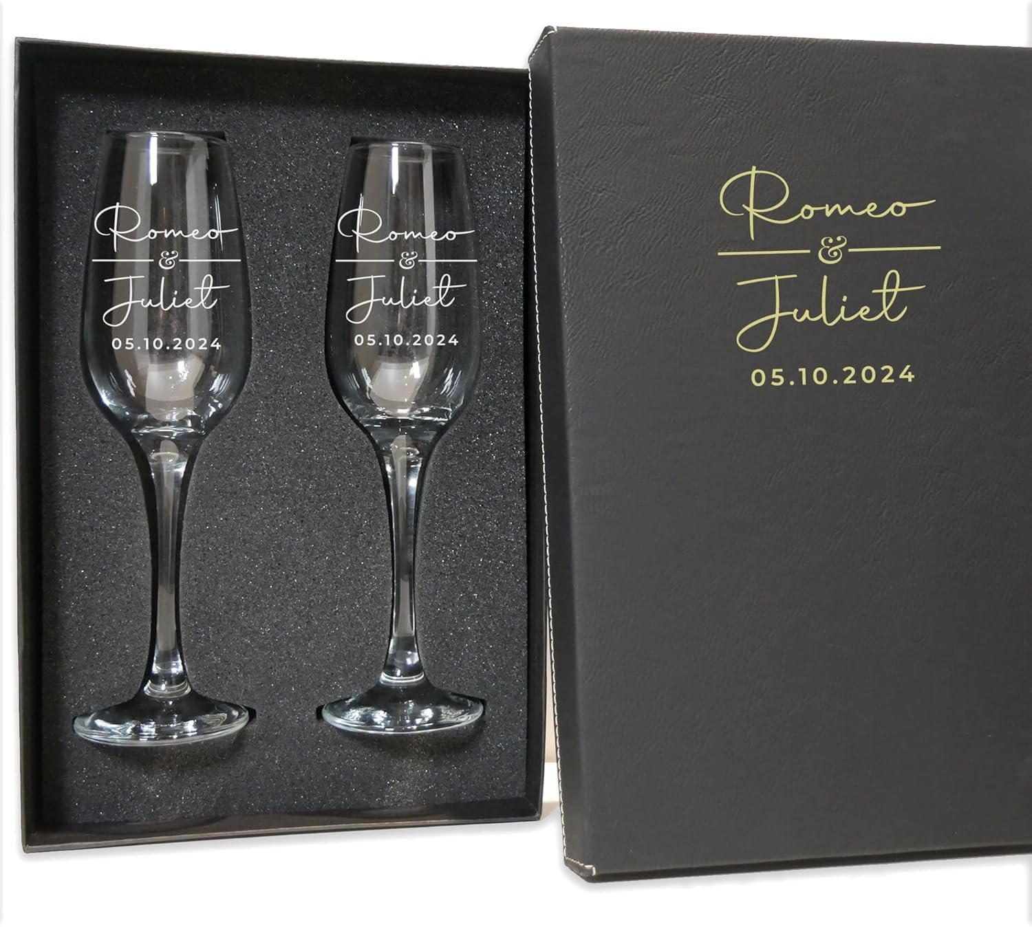 OPTIONAL GIFT BOX – Level up our custom champagne flutes by adding a unique engraved gift box. Engraved champagne flutes for the couple make a unique gift idea for weddings, anniversaries, bridal showers, engagement parties, housewarming, Valentines day and other special occasions. A unique Mr & Mrs addition to a home bar, entertainment area or kitchen