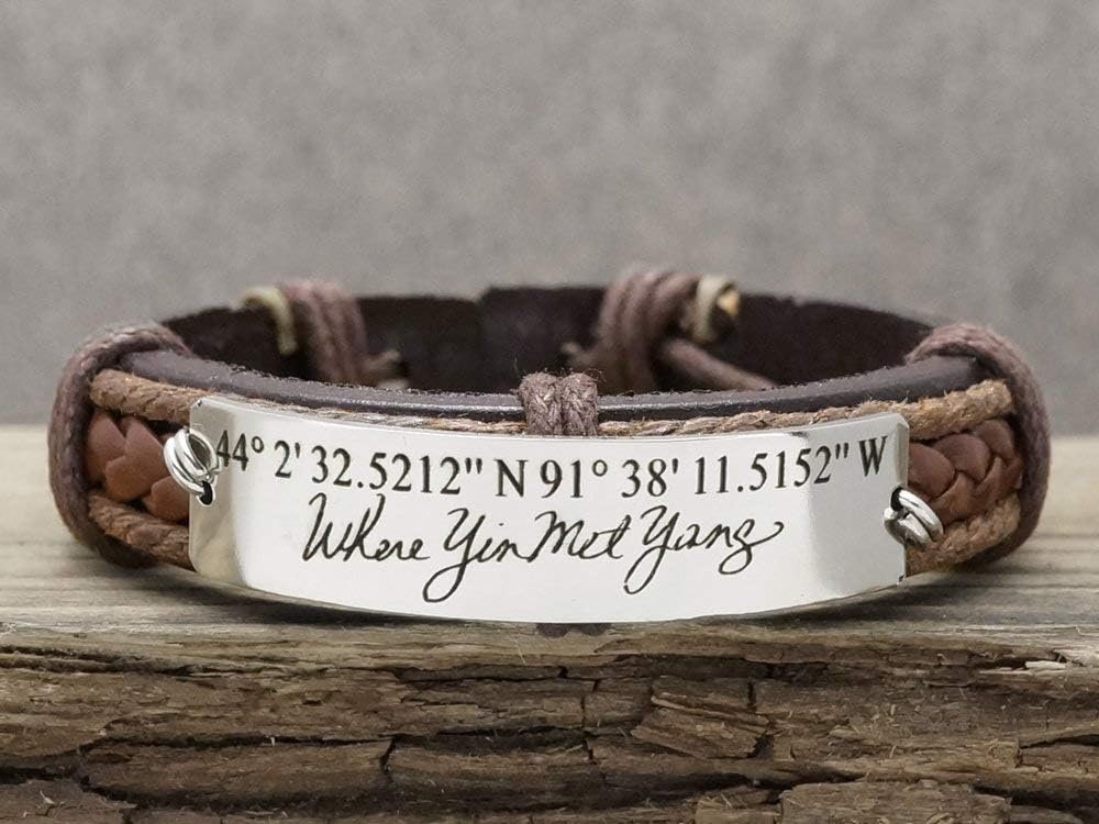 One-of-a-kind keepsake bracelet is engraved with the handwriting of the coordinates and quote.