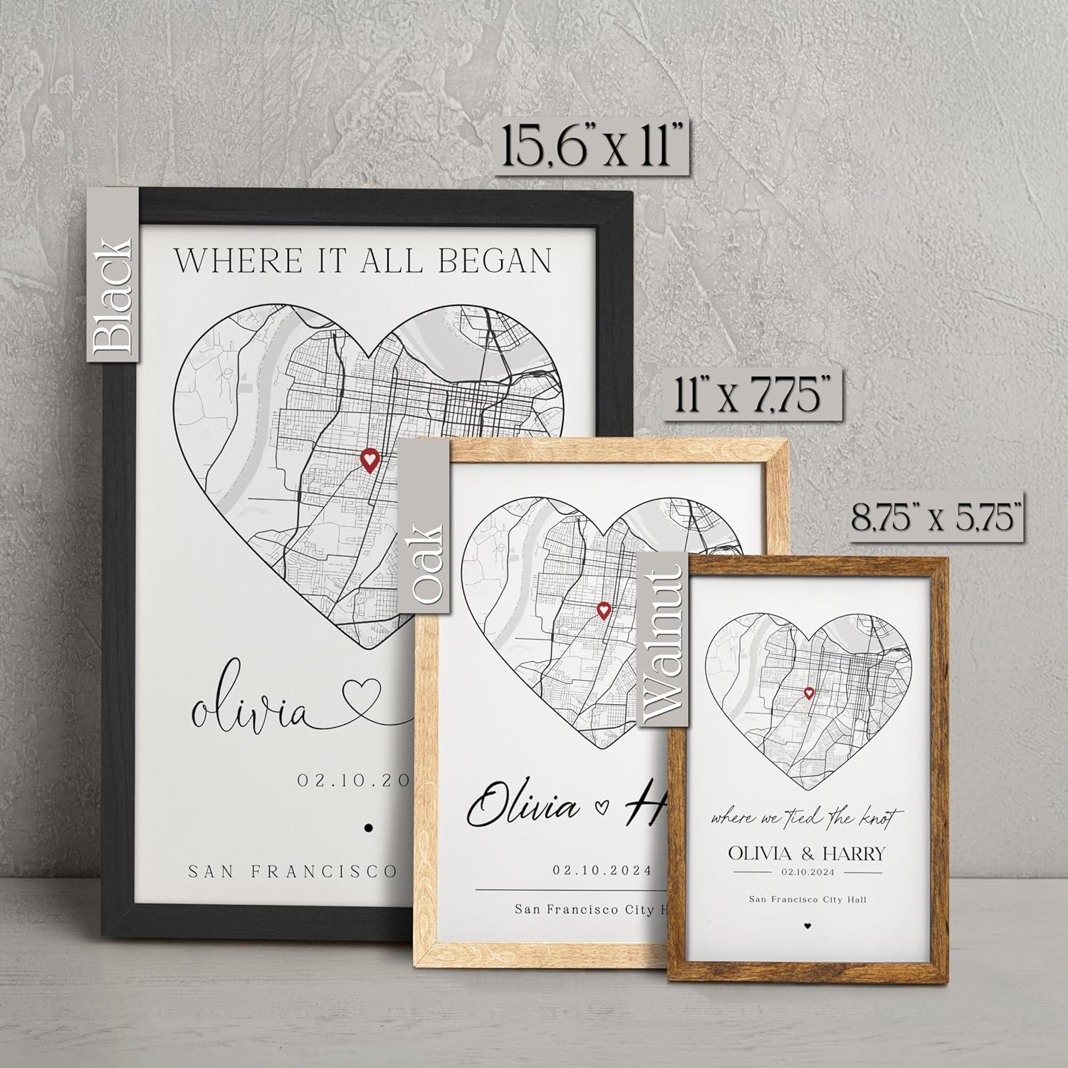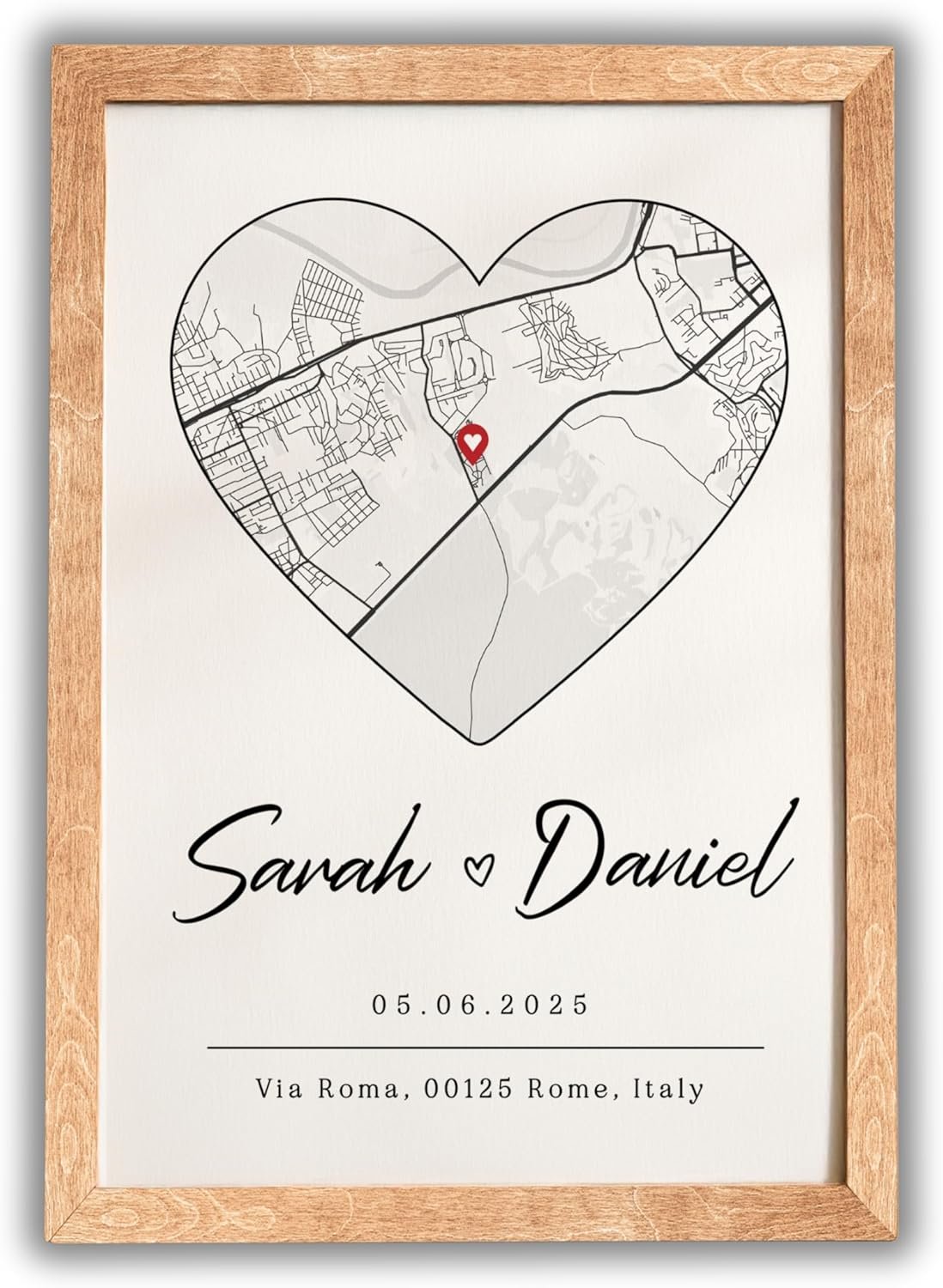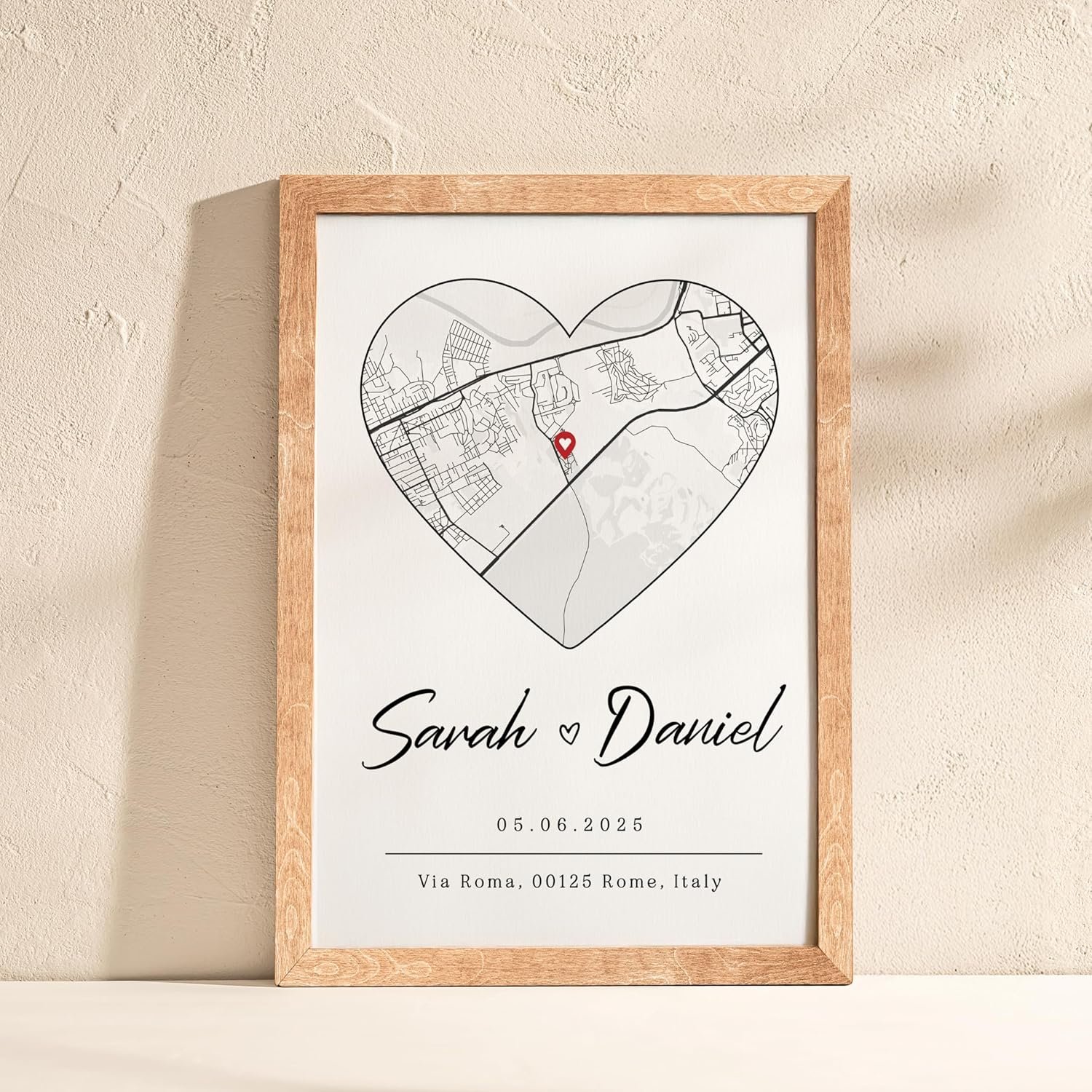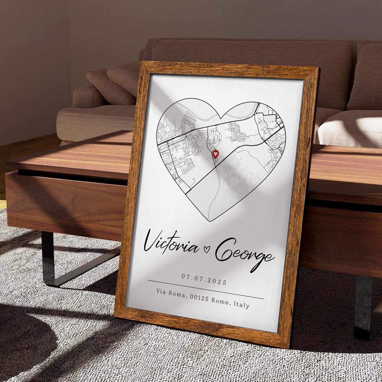 Customized with Your Special Place: Celebrate the spot where it all began – your first meeting, engagement, wedding, or new home – highlighted with a heart-shaped map and pinpoint marker.