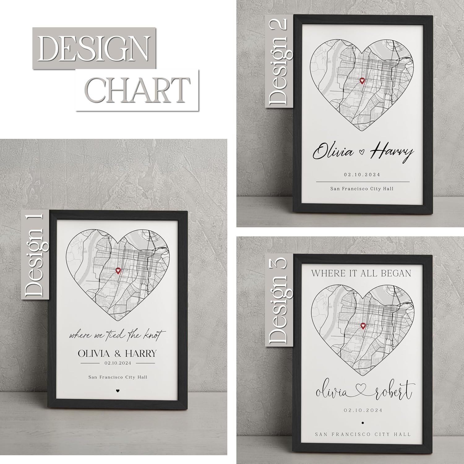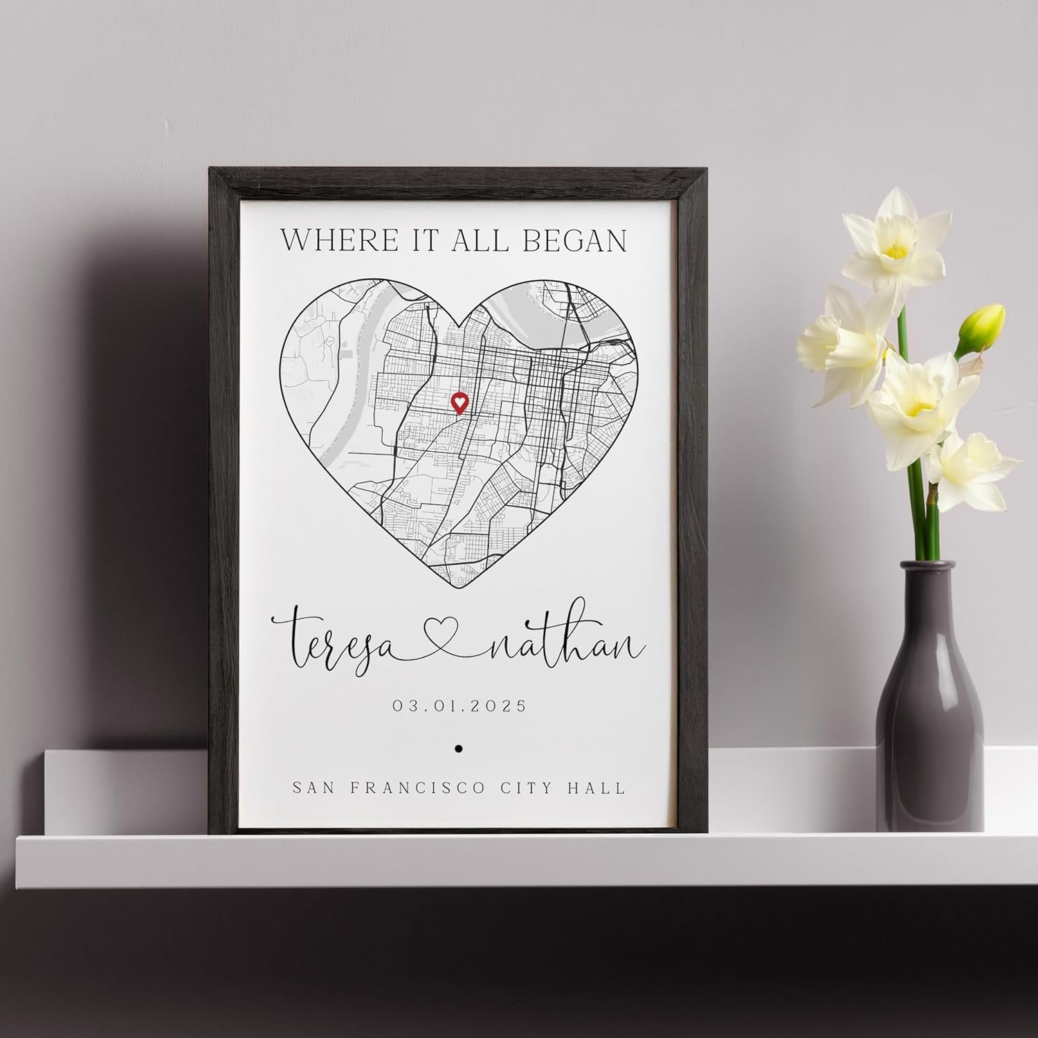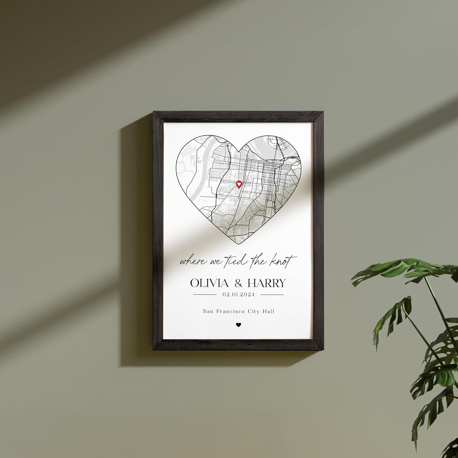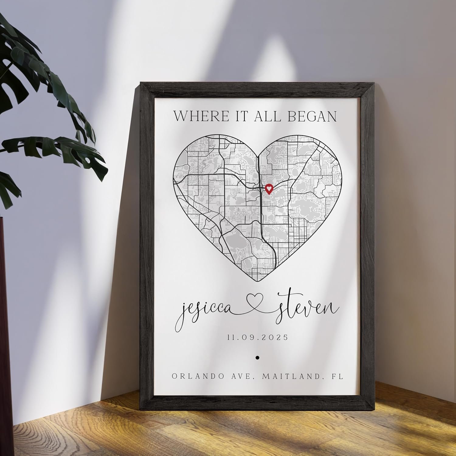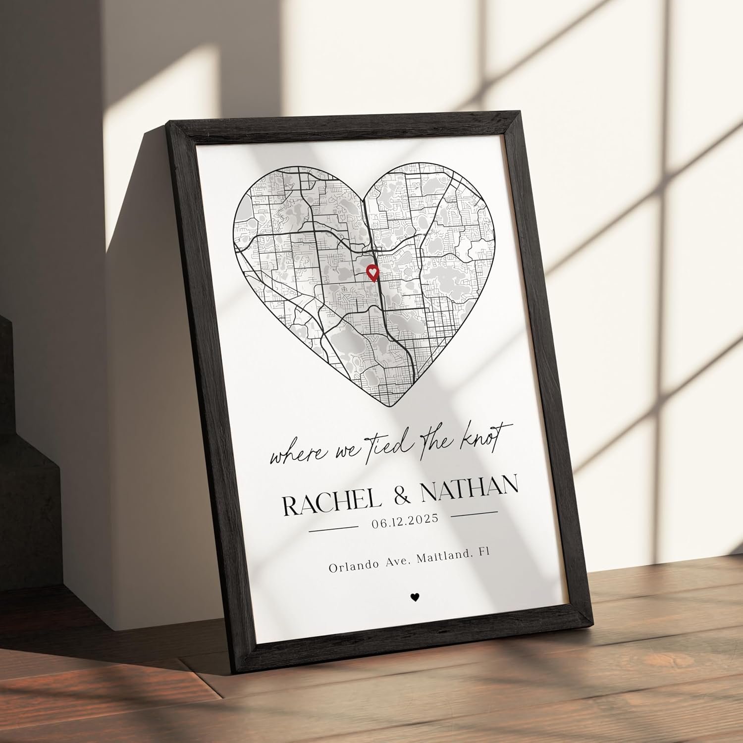 Customized with Your Special Place: Celebrate the spot where it all began – your first meeting, engagement, wedding, or new home – highlighted with a heart-shaped map and pinpoint marker.