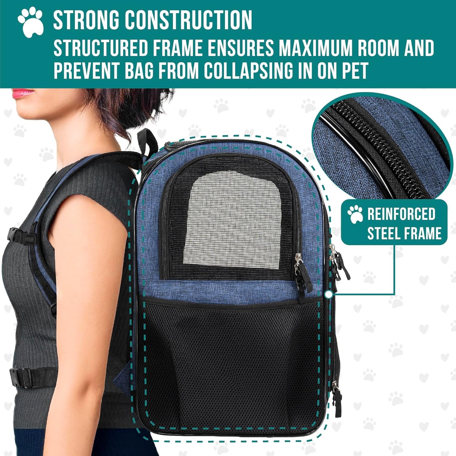 SUPERIOR COMFORT, FIT, AND CONVENIENCE: The back and shoulder straps of the dog carrier backpack are equipped with extra thick padding for more comfort during long trips. This cat backpack comes with both waist and chest buckles to give you extra support. We also added side pouches and a front pocket to store essential pet supplies and a collapsible pet bowl to keep your pet hydrated! This airline approved cat backpack carrier is a must have essentials for dog mom, dad, owner and trainer.