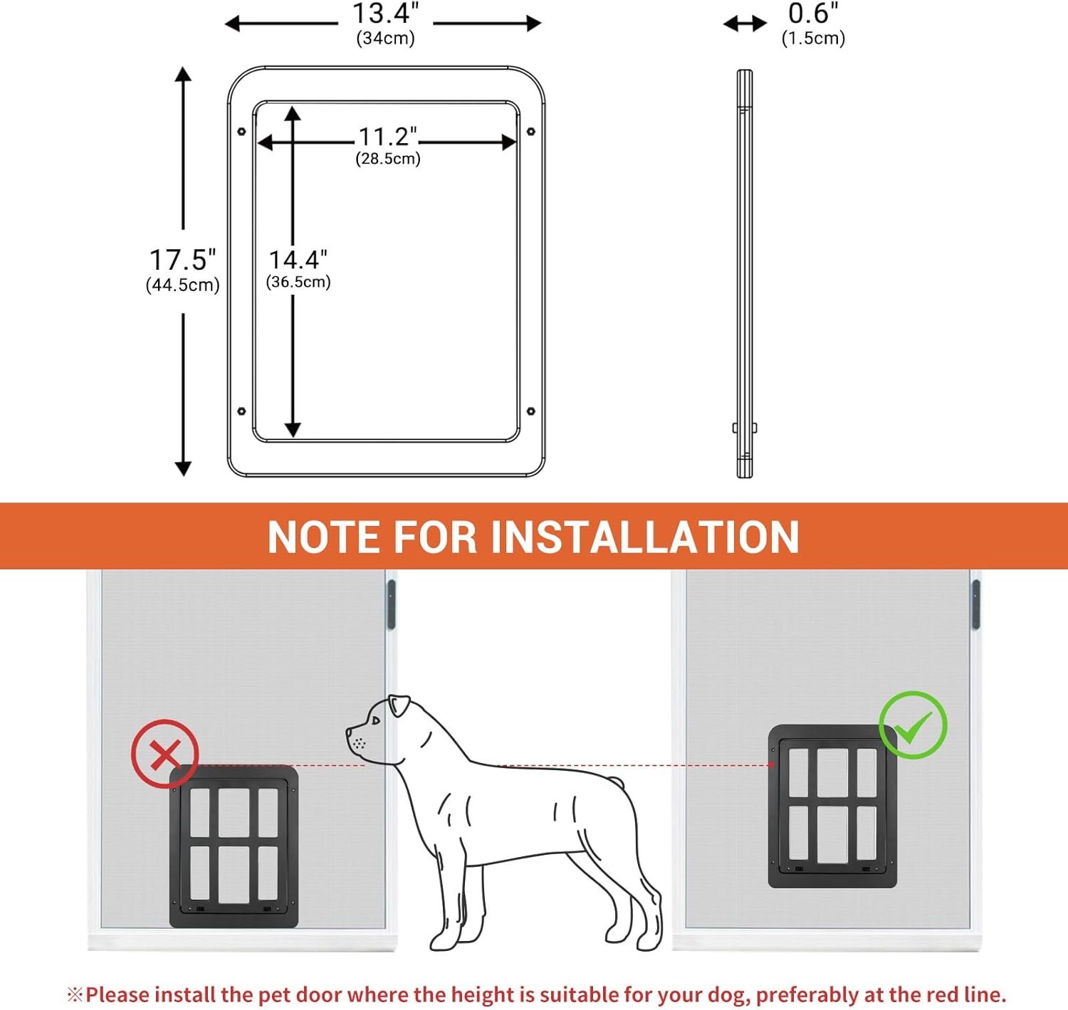 Size: Outer frame: 17.5” * 13.4”, inner door flap: 14.4″ * 11.2”, the thickness of pet door: 0.67”, suitable for sliding door, screen door, window and other screen areas.