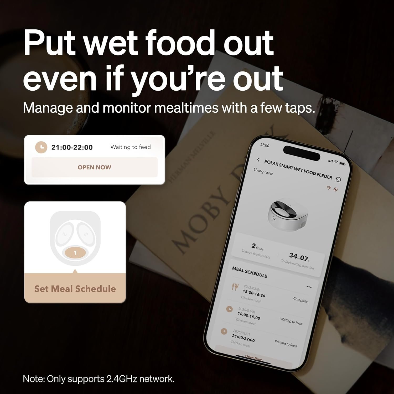 Smart App Control for Hassle-Free Feeding: Schedule meals, monitor feeding status, and dispense food instantly from anywhere using the PETLIBRO’s dedicated app of the automatic cat food dispenser for wet food(Only supports 2.4GHz network), the remote “Feed Now” feature lets you reopen a previous unfinished meal to ensure no portion goes to waste and open the next meal ahead of time. If you do not set any schedule, “Feed Now” also can help to open the lid anytime anywhere.