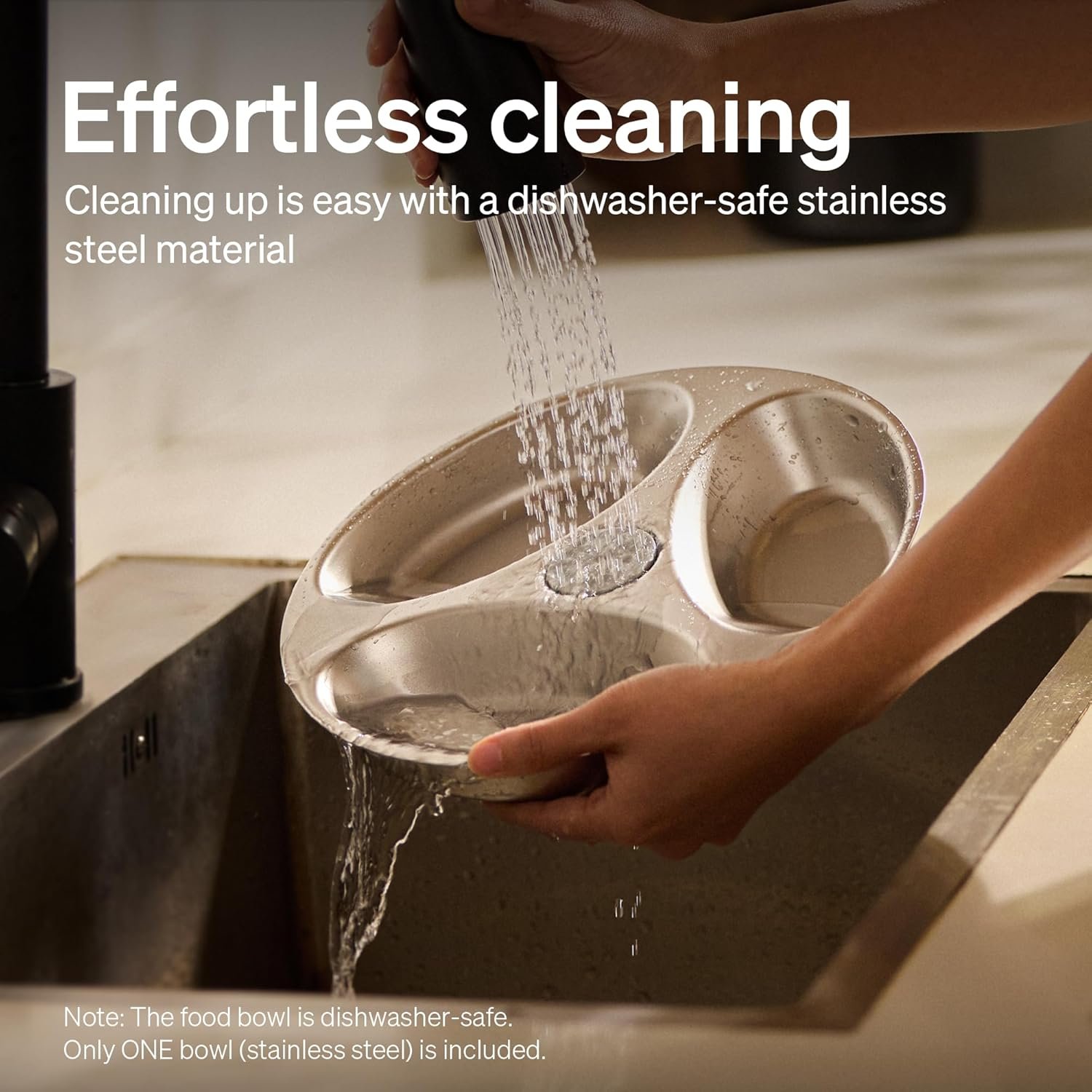 The feeding bowl is dishwasher-safe (up to 158℉/70℃) or can be hand-washed with water for easy upkeep.