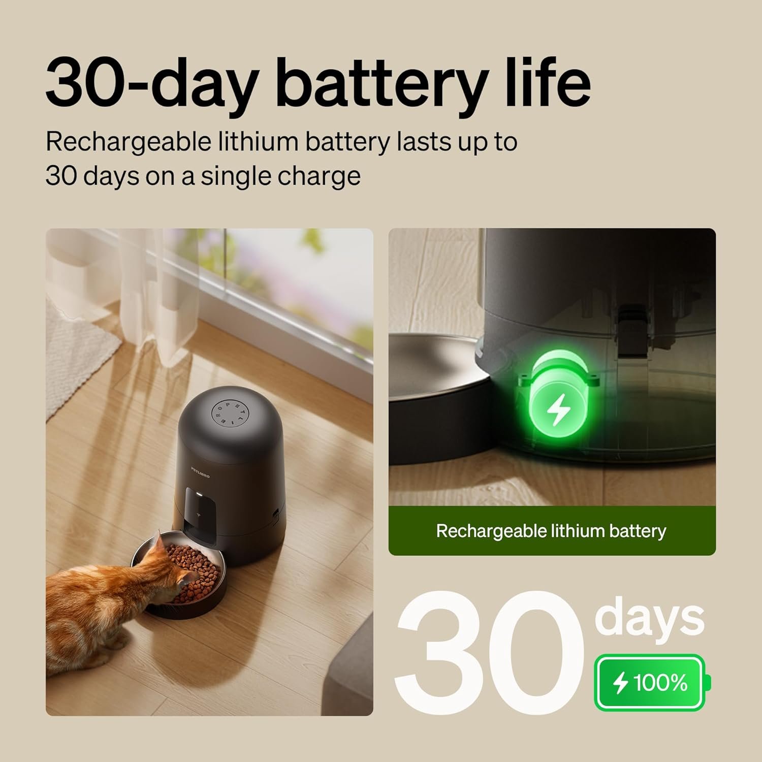 Rechargeable Battery-Operated Feeder – The Wi-Fi automatic cat food dispenser is powered by a built-in rechargeable lithium battery. It takes 8 hours to be fully charged and has a battery life of up to 30 days. It not only saves the cost of battery replacement, but is also more environmentally friendly and flexible; No more limitations of power sockets, giving you more flexibility in choosing its placement.