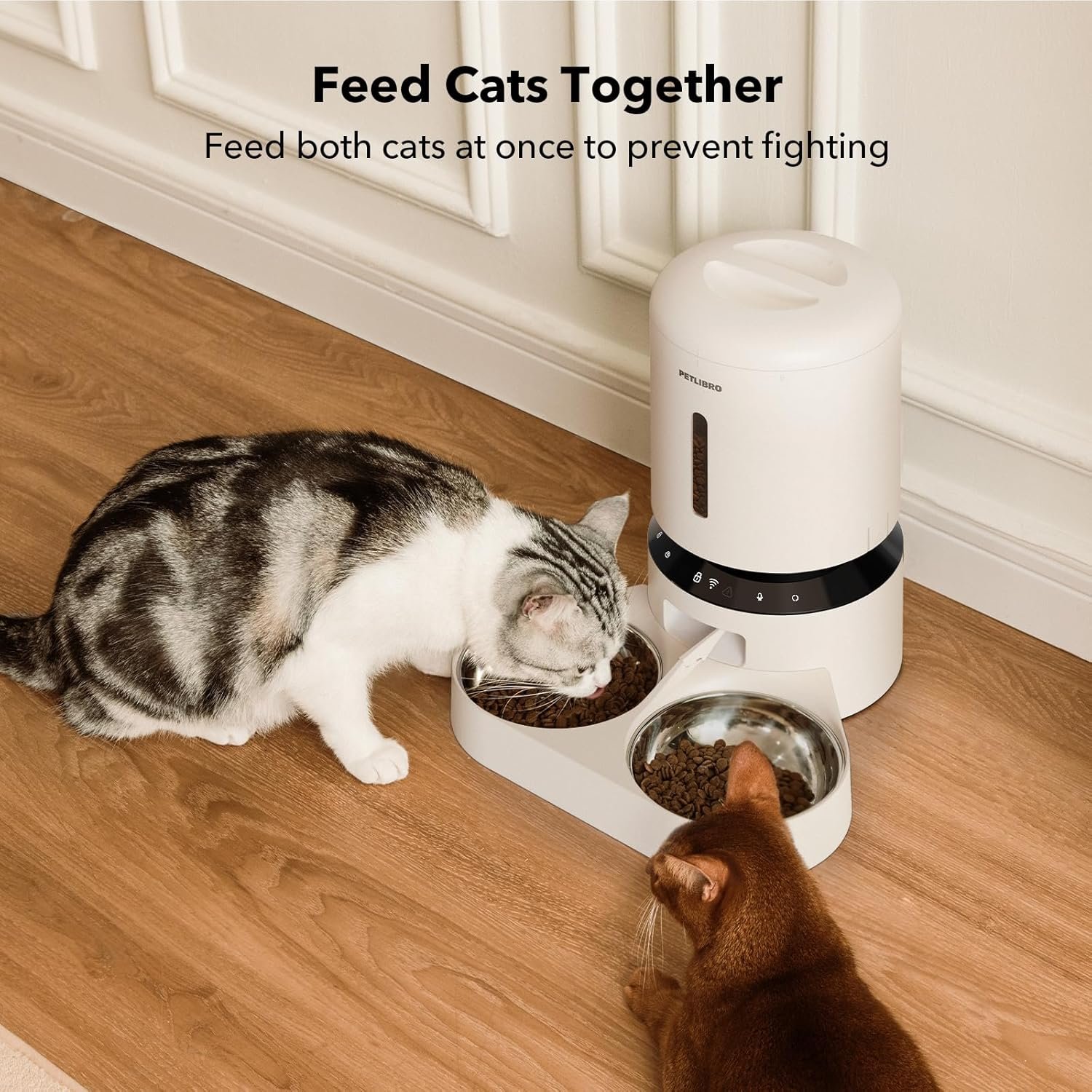 TWO CATS FRIENDLY DESIGN: PETLIBRO wifi automatic cat feeder is designed for two-cat families. Dry food is evenly distributed to two bowls to avoid competition for food grabbing. 5L large capacity to meet the diverse needs of cats and dogs. Up to 10 meals can be preset per day, and the amount of each meal can be freely adjusted (1-50 portions).