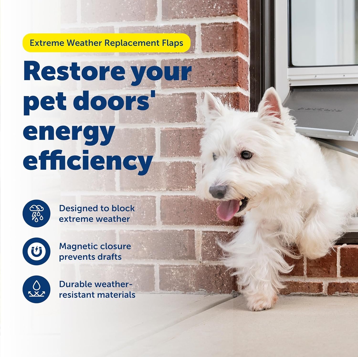 No matter the season, PetSafe Extreme Weather Sliding Glass Pet Door Replacement Flaps are made to help your home stay comfortable and protected. Whether it’s cold winter drafts or sweltering summer heat, these durable flaps work hard to shield your home from the elements. The triple-flap design features a center insulated flap surrounded by clear vinyl flaps on both sides, adding a thermal barrier that helps reduce energy loss while giving your pets easy access to the outdoors. Ideal for replacing worn or damaged flaps on your existing PetSafe Extreme Weather Sliding Glass Pet Door, these weather-resistant flaps come equipped with magnetic closures at the bottom to keep the door securely shut. This design ensures minimal air leakage and improved energy efficiency in your home. Available in medium and large sizes, they fit the Extreme Weather Sliding Glass Pet Door models ZPA17-17175 and ZPA17-17176. The replacement process is straightforward—just three simple steps, no tools required. Whether you’re preparing for the changing seasons or just need a fresh flap insert, these flaps are designed to install quickly, last through the elements, and keep your home protected. Designed for pet parents who want functionality without compromising on energy savings, these flaps are also perfect for homes with active pets that go in and out frequently. Since 1988, PetSafe has been driven by a simple belief: safe, healthy pets lead to happier lives for pets and their families. For over 25 years, we’ve been dedicated to enhancing the lives of pets and the people who love them, treating every pet as a cherished family member and delivering life-changing innovations designed to enrich every moment. With U.S. roots and a global reach, our vet- and trainer-recommended products are built for every pet and backed by exceptional customer support. From backyards to dog parks, we’re on a mission to create fields of joy for happy, healthy, and safe pets.
