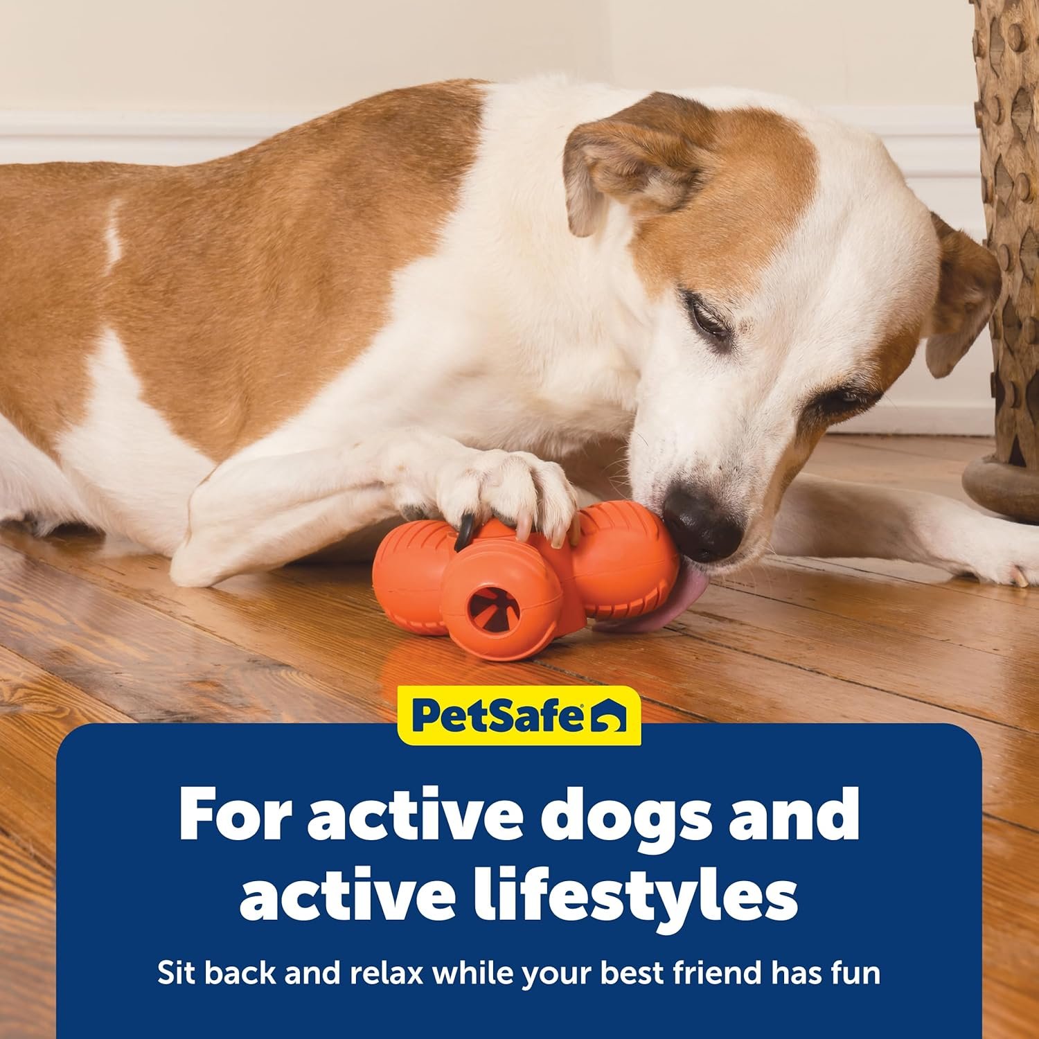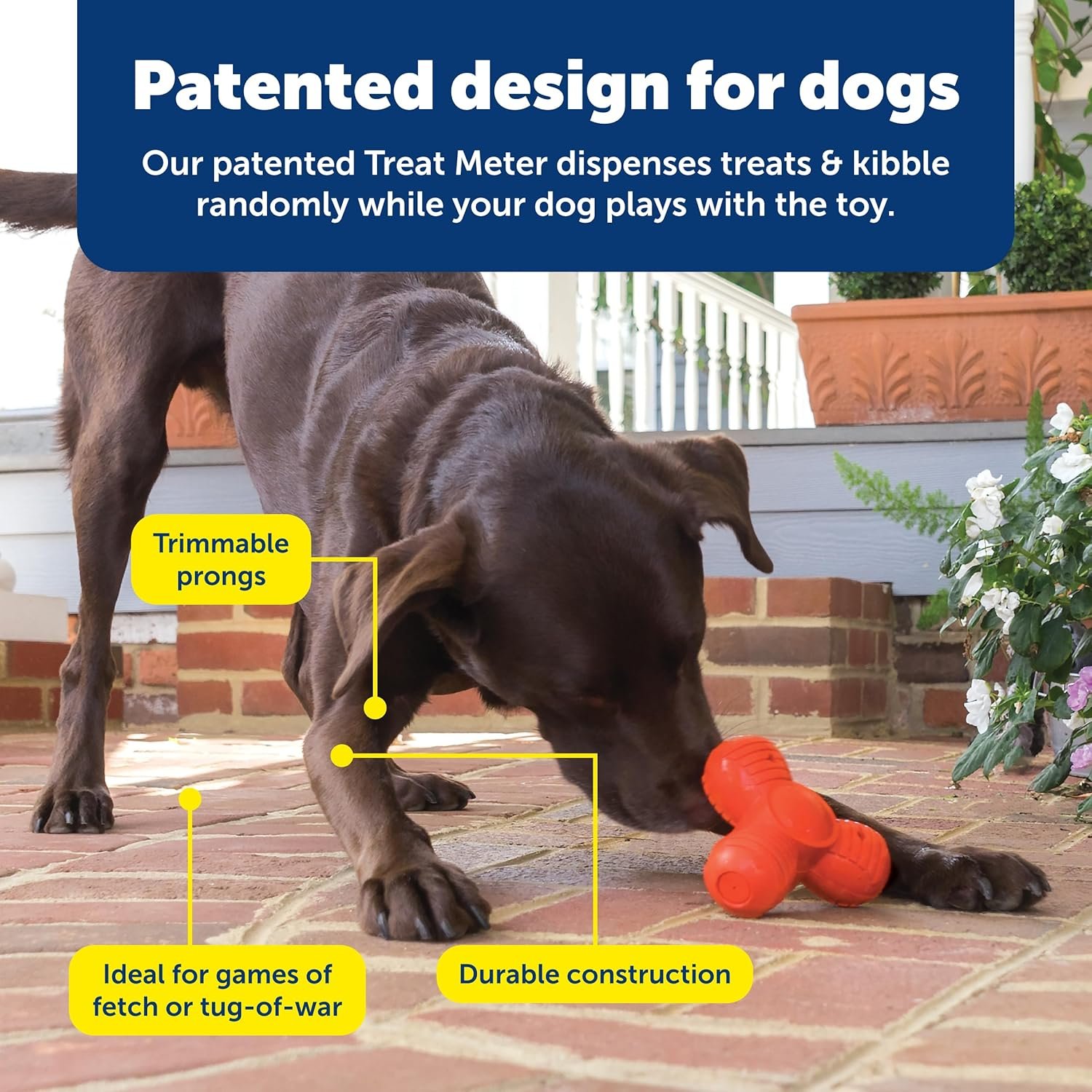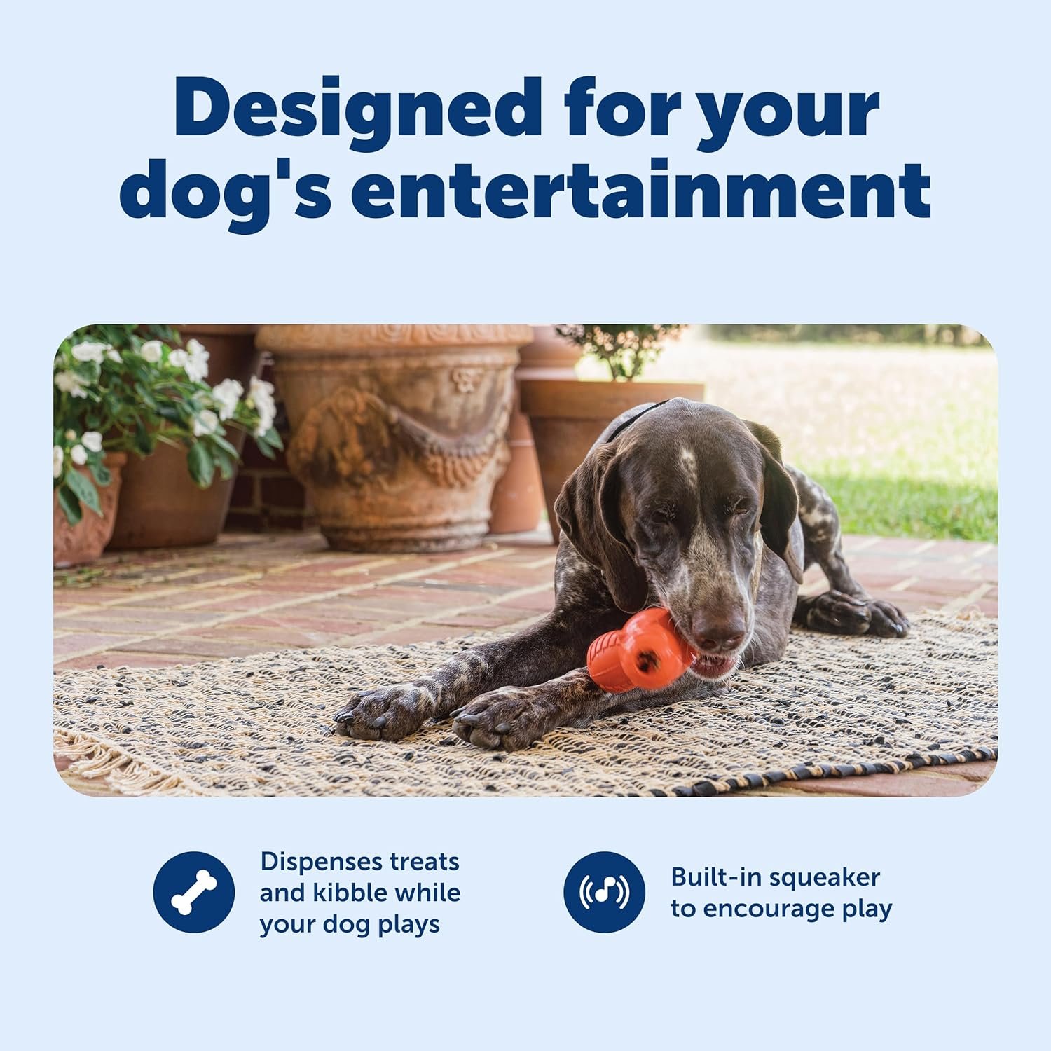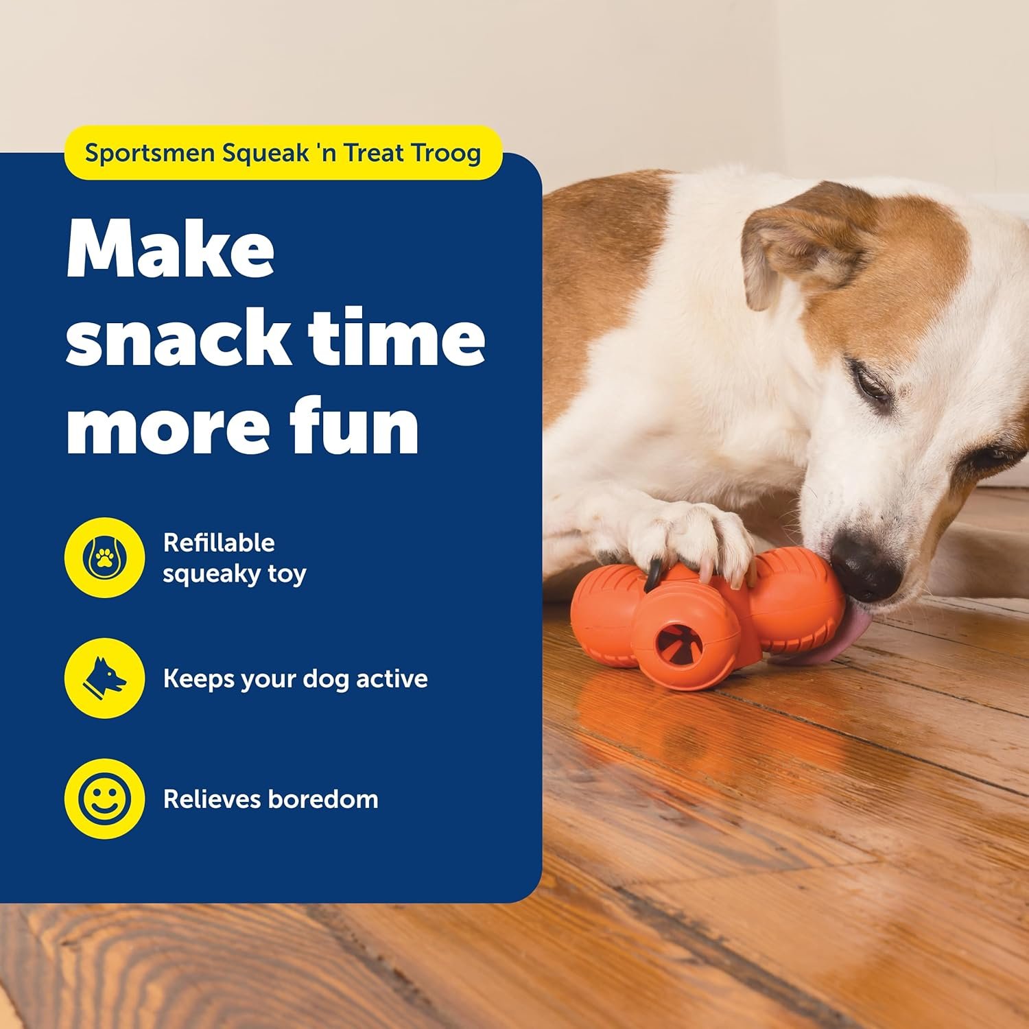 Pet safe sportsmen Blaze orange troog Medium squeak ‘n treat toys are the First treat-dispensing toys that also squeak! fill the toy with your dog’s favorite treats. The treats pop out as your dog plays. The built-in reward keeps your dog actively engaged in healthy play instead of destructive chewing. The squeak adds to the excitement! the squeaky sound appeals to your dog’s natural prey drive. The durable rubber design has a funky bounce for games of fetch or tug-of-war. Trim the patented treat meter prongs so more treats fall out.
