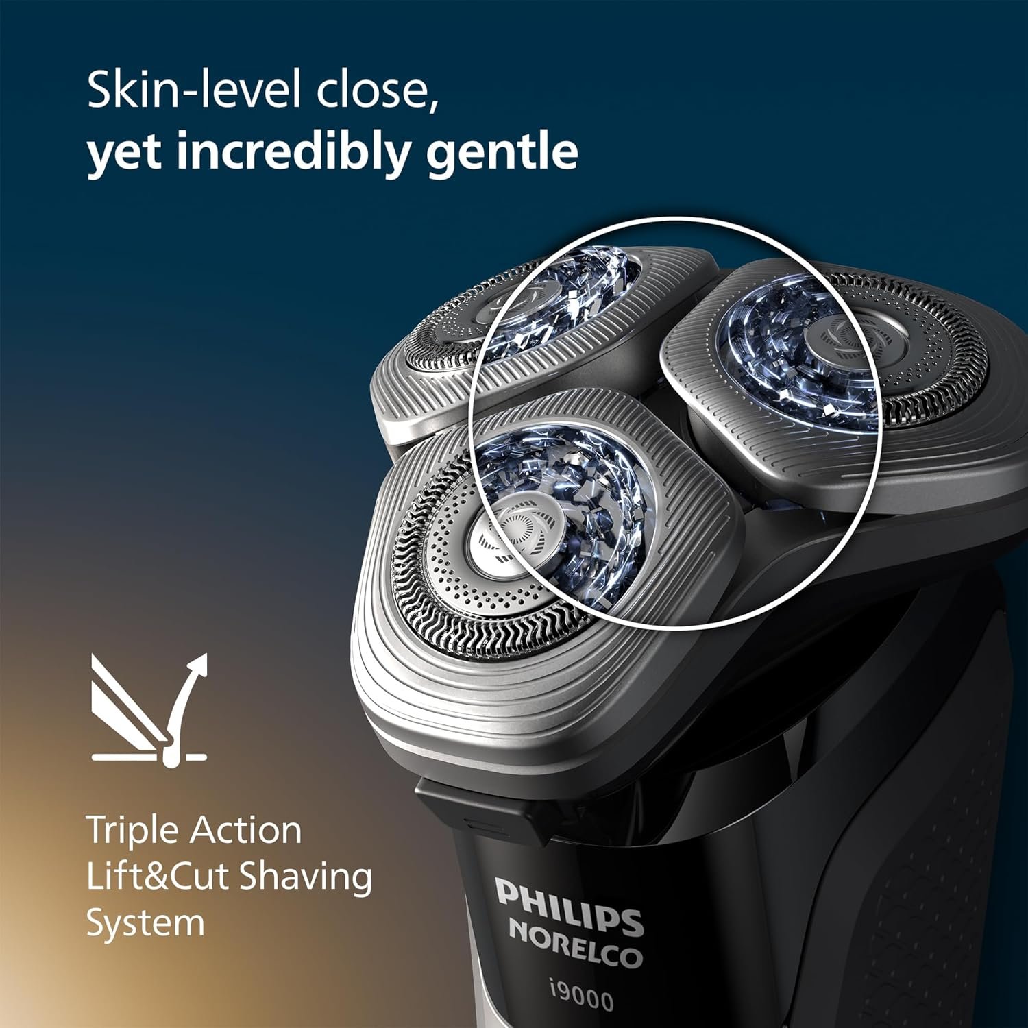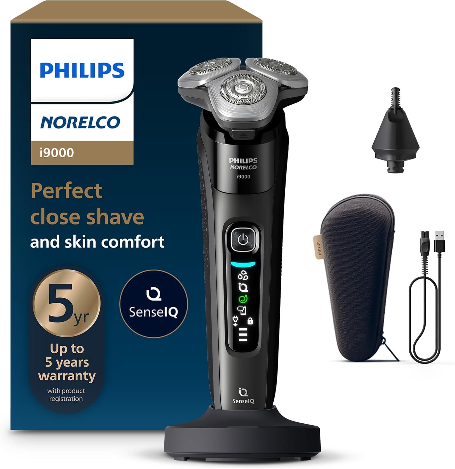 From the #1 electric shaver brand¹, now with up to a 5-year warranty³. Philips Norelco i9000 is the latest among Philips electric shavers for men with a Triple Action Lift & Cut system that cuts hair up to -0.00mm, even in hardest-to-shave areas − for long-lasting closeness. Fully flexible and compact heads with skin stretching patterns dynamically adapt to every curve of your face for 20% more precision even in hard-to-shave areas². The Dual SteelPrecision Blades rotate 360 degrees to cut hair in any direction with 7 million motions per minute to ensure an efficient shave on a 1, 3, or 7-day beard, making it a perfect beard trimmer for men. SenseIQ technology powered by AI delivers intelligent skin comfort personalized to you. The most advanced Hydro SkinGlide coating delivers 50% smoother gliding² on the skin to shave and manscape with less friction and maximum comfort. Enjoy a first-class shaving experience and shave dry or wet, even in the shower. Fully charge your face shaver within 1 hour using the elegant stand. A stand serves for both conveniently charging your device and neatly storing it away. In a hurry? Plug in your shaver for 5 minutes and get enough power for 1 full shave. Philips drives sustainability in all aspects of product creation. The brand’s ambition is to reduce waste and minimize the number of USB adapters in the market. ¹ Source: Euromonitor International Limited, retail value RSP, per body shavers category definition, 2024 data, research conducted in December 2024 ² Compared to its predecessor ³ 2 years + 3 years warranty upon registration within 90 days on Philips.com