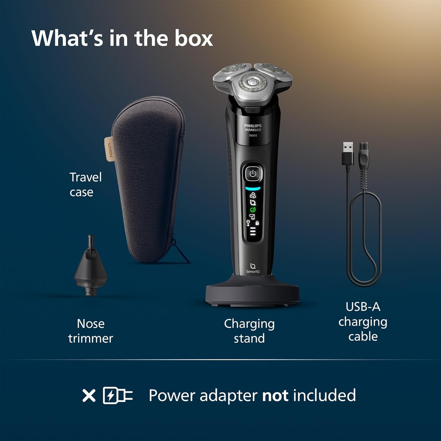 The set includes: 1x Shaver i9000, 1x nose trimmer, 1x charging stand, 1x travel case, 1x cleaning brush, 1x USB-A cable; power adapter not included