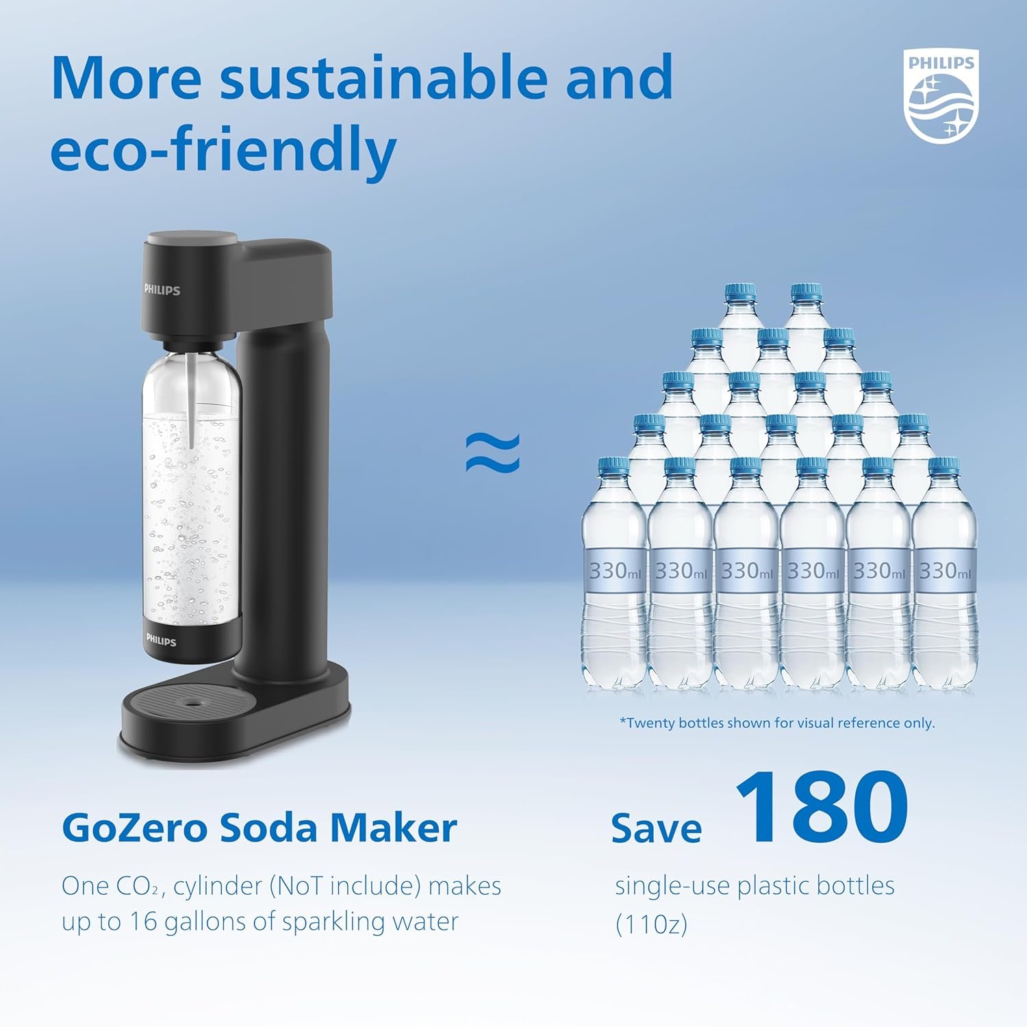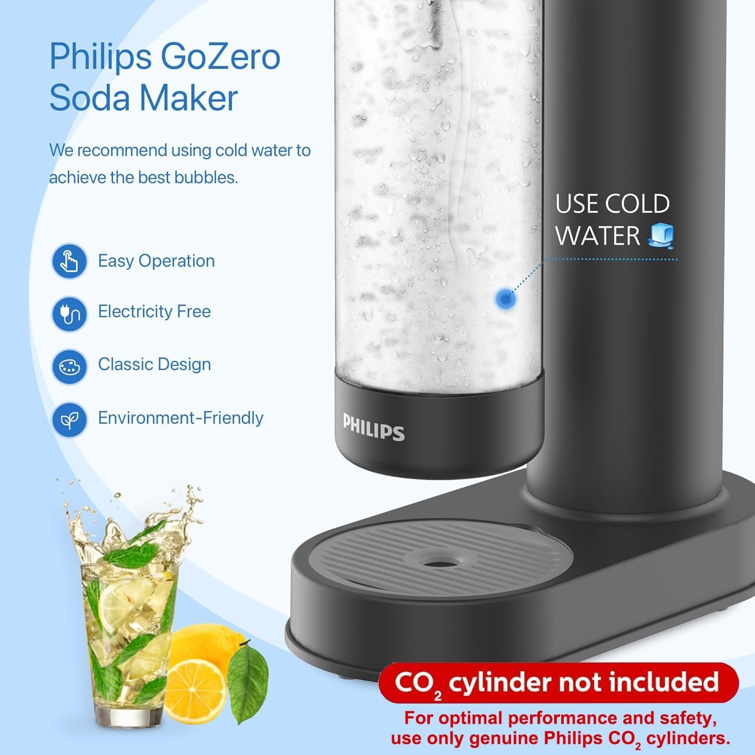 โ๏ธEffortless Carbonation: Enjoy PHILIPS soda water machine that operates without electricity, create delicious sparkling water and soda drinks anywhere at home or outdoor. Fill the carbonating bottle with cold, clean water between the marked filling lines.