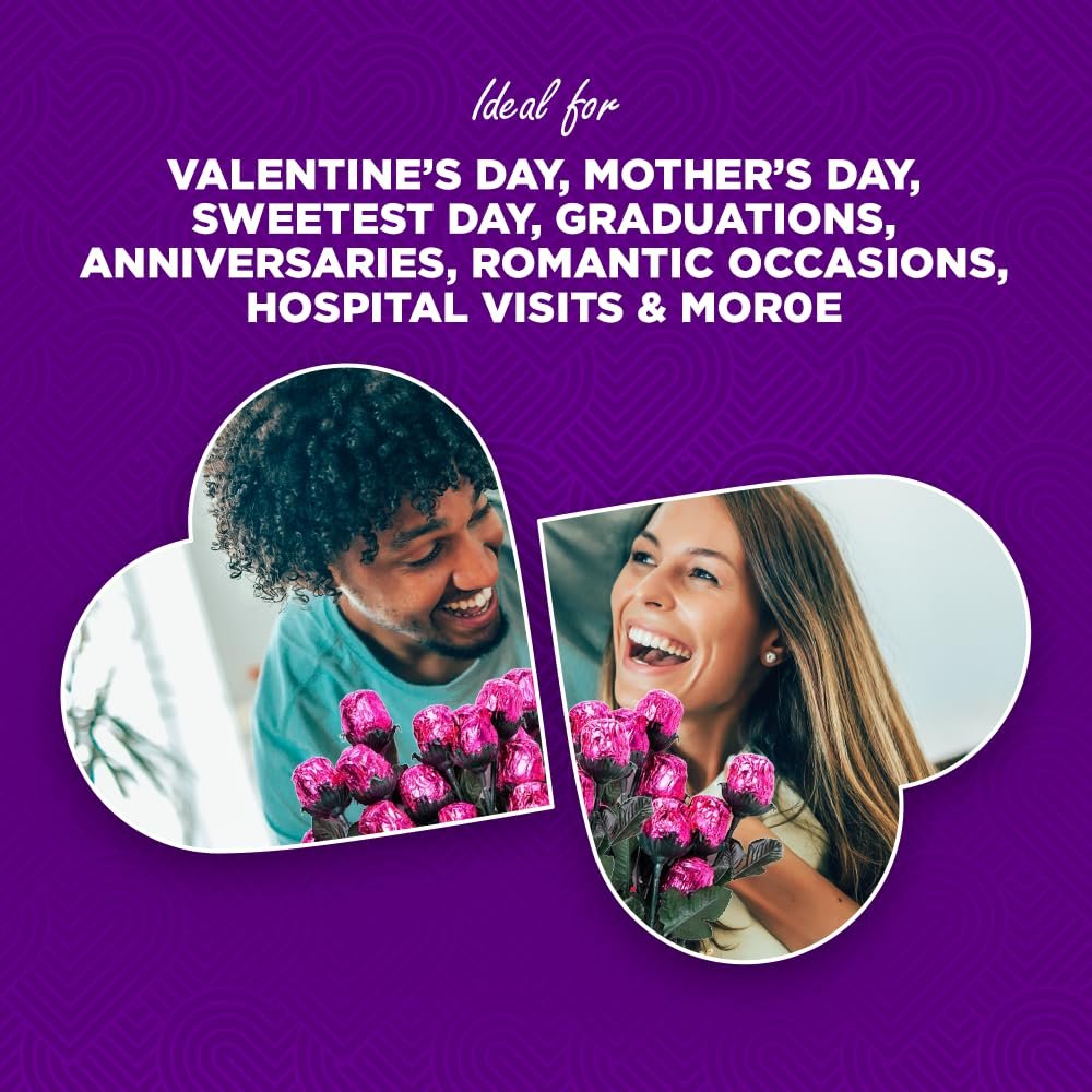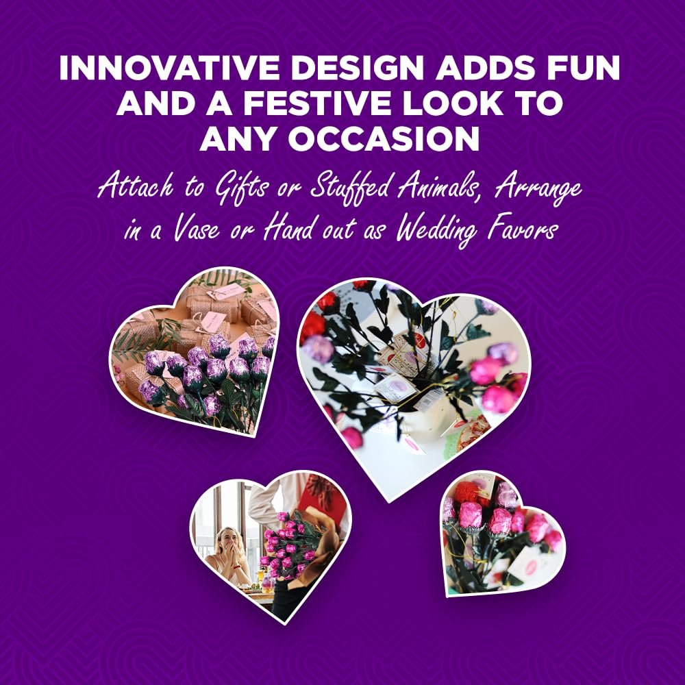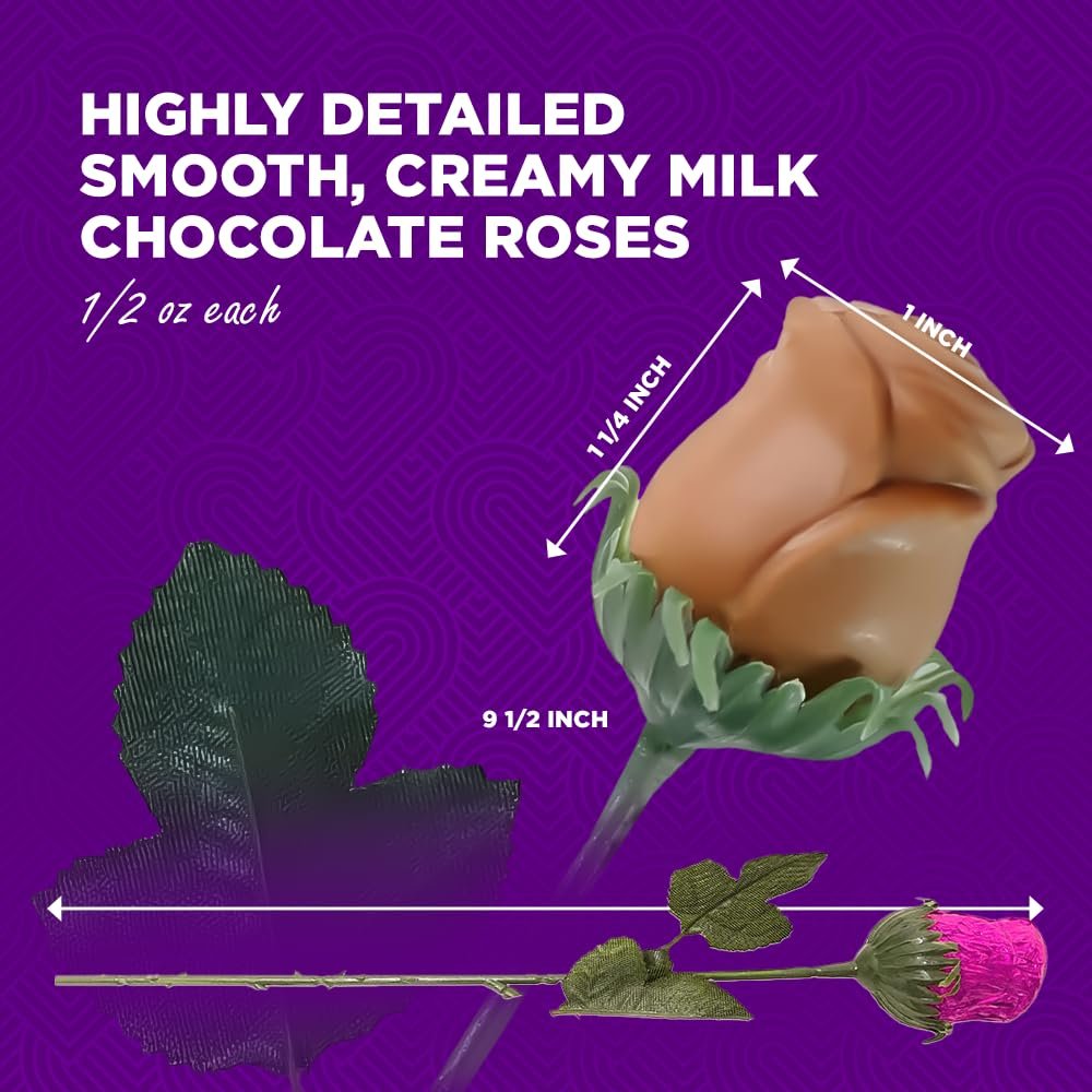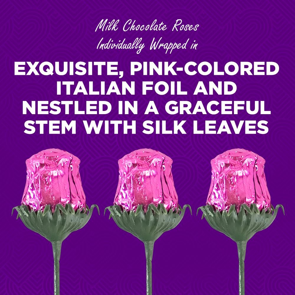 Exquisite Italian Foil: Each highly detailed, solid milk chocolate rose is wrapped in vibrant pink Italian foil, nestled in a graceful green stem with silk leaves – great for attaching to gifts, stuffed animals or arranging in a vase for any occasion.