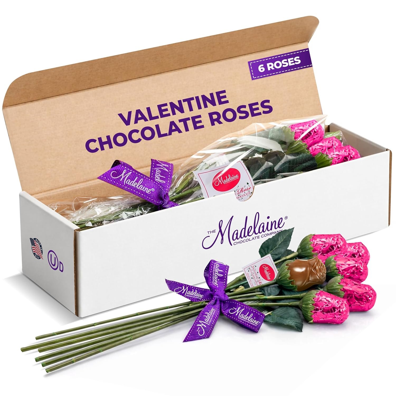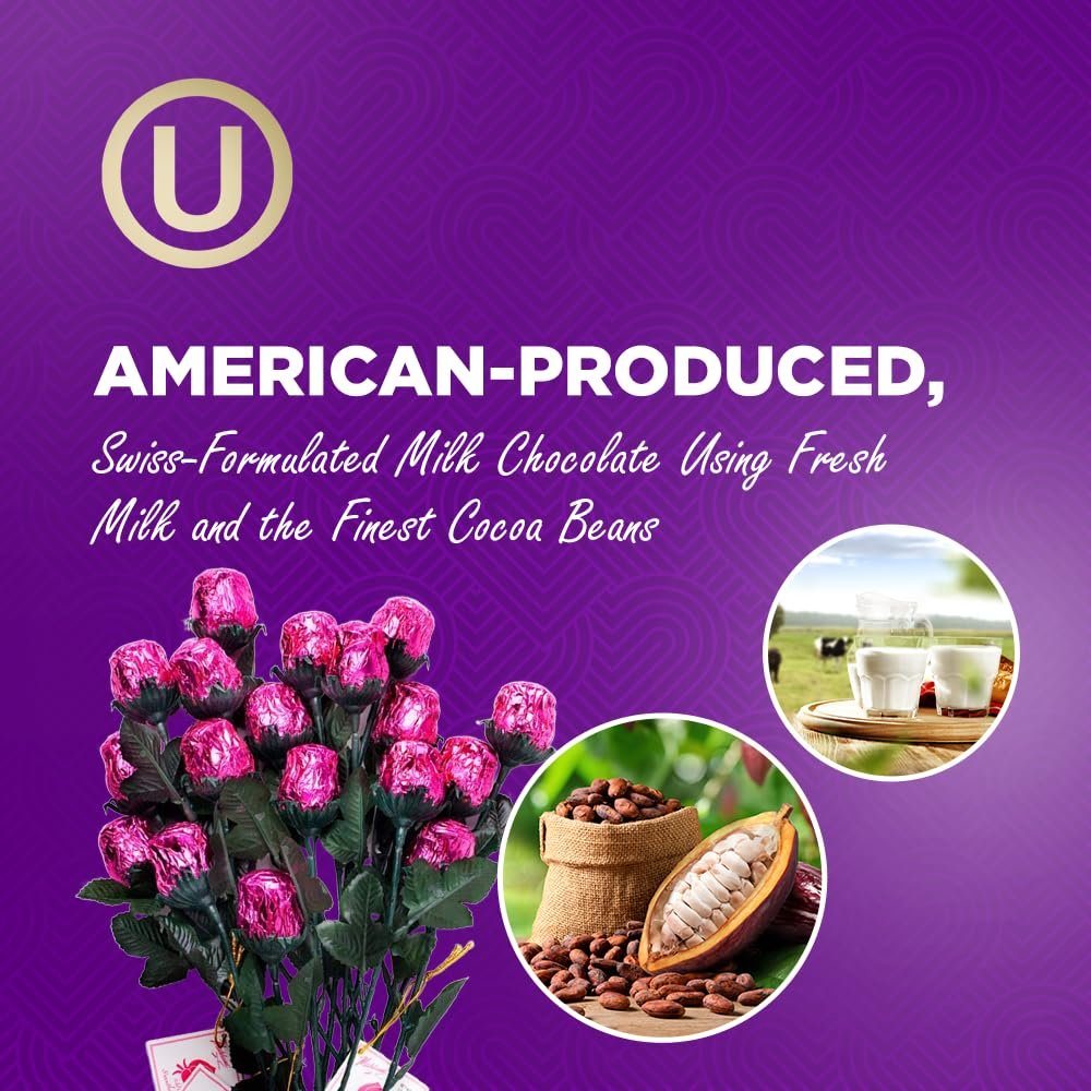 Luscious Milk Chocolate: Using the finest cocoa bean selection and fresh milk to create premium American-made, Swiss-formulated chocolate, each mouthwatering Madelaine Solid Premium Milk Chocolate Rose snaps when you bite into it and melts in your mouth.
