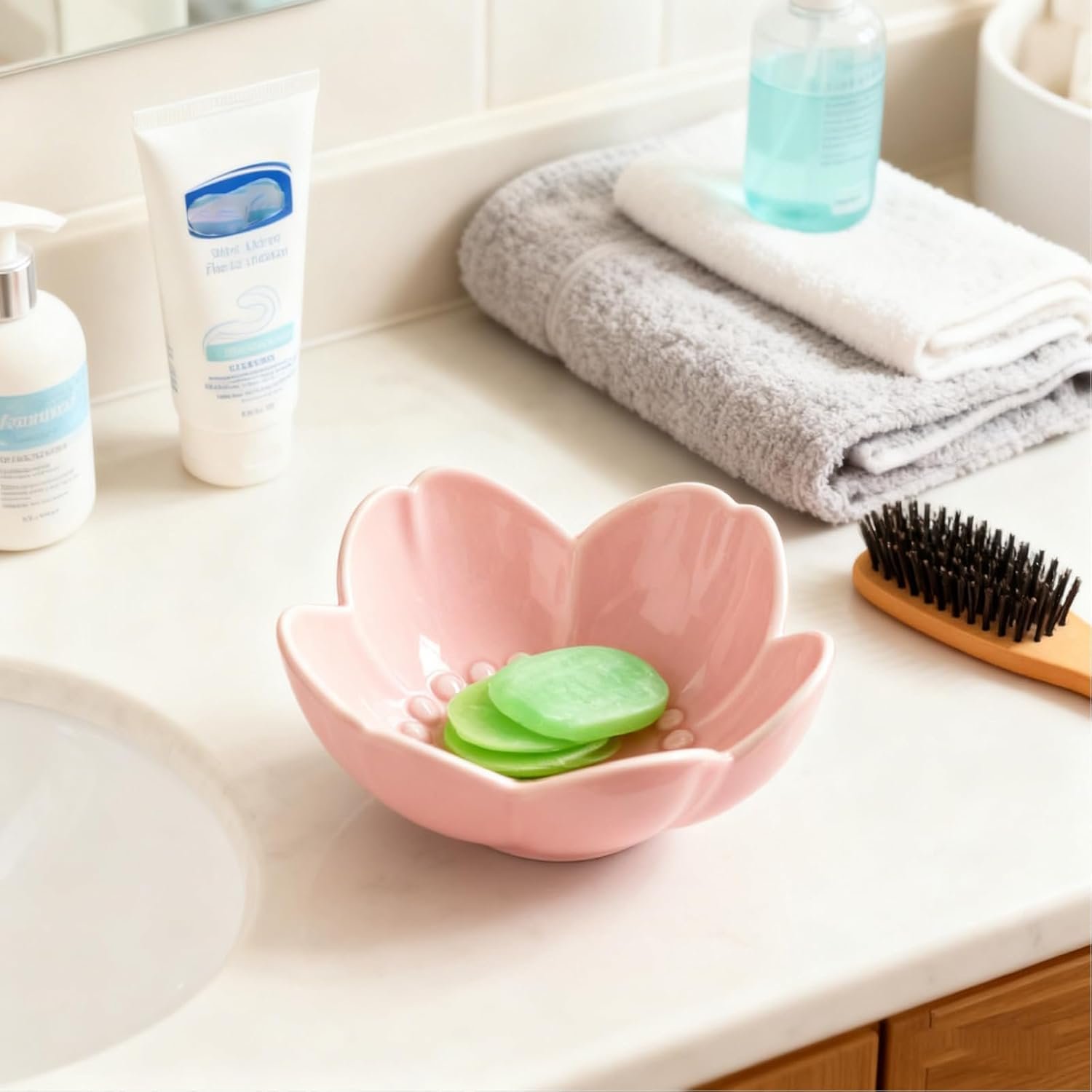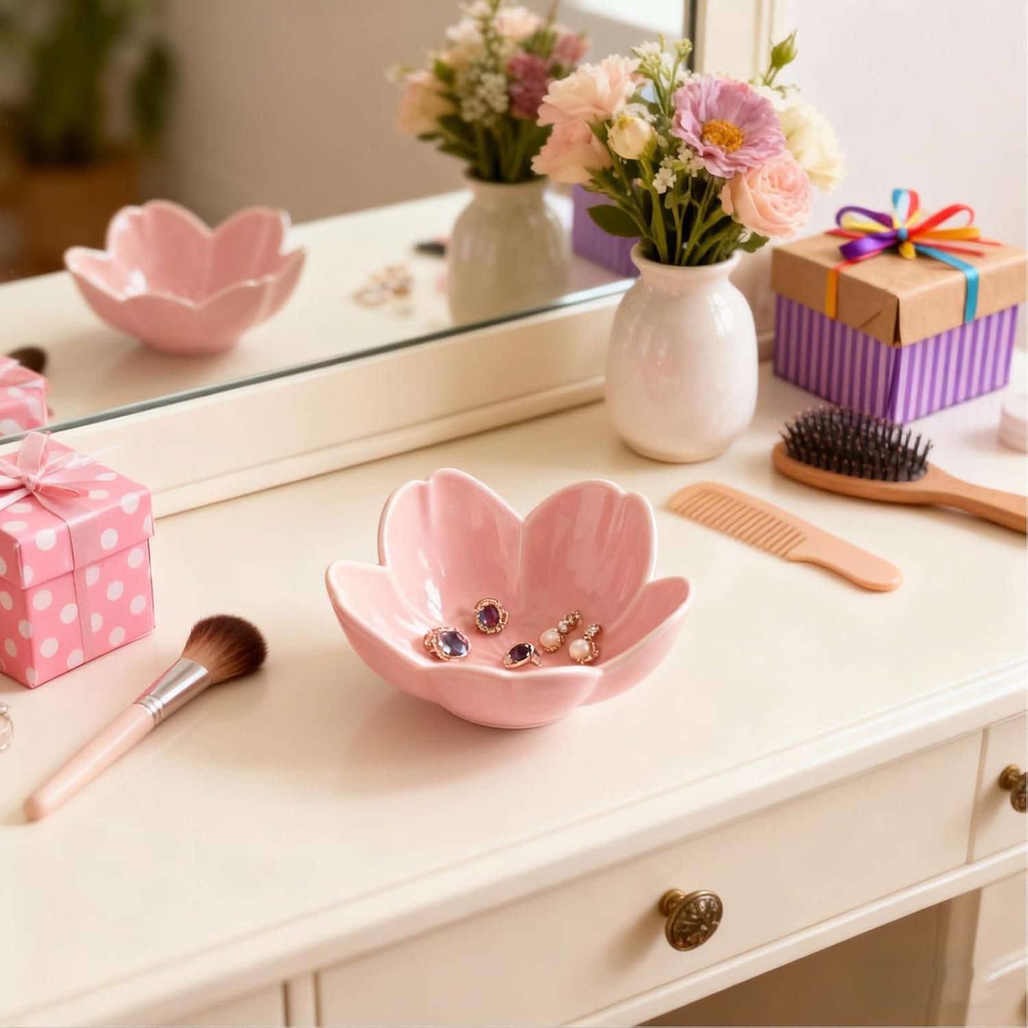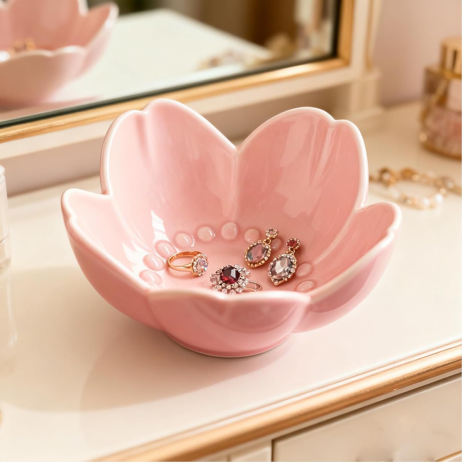 ELEGANT DESIGN NIGHTSTAND DECOR: Beautifully ring dish is crafted durable ceramic featuring a delicate pink flower shape design, perfect for adding a decorative touch to any space. This charming bathroom accessory offers practical storage for your small items while adding a touch of elegance to any space. Whether used on your vanity, nightstand, or dresser. Its versatile design makes it suitable for various rooms, ensuring you always have a stylish solution for organizing your jewelrys.