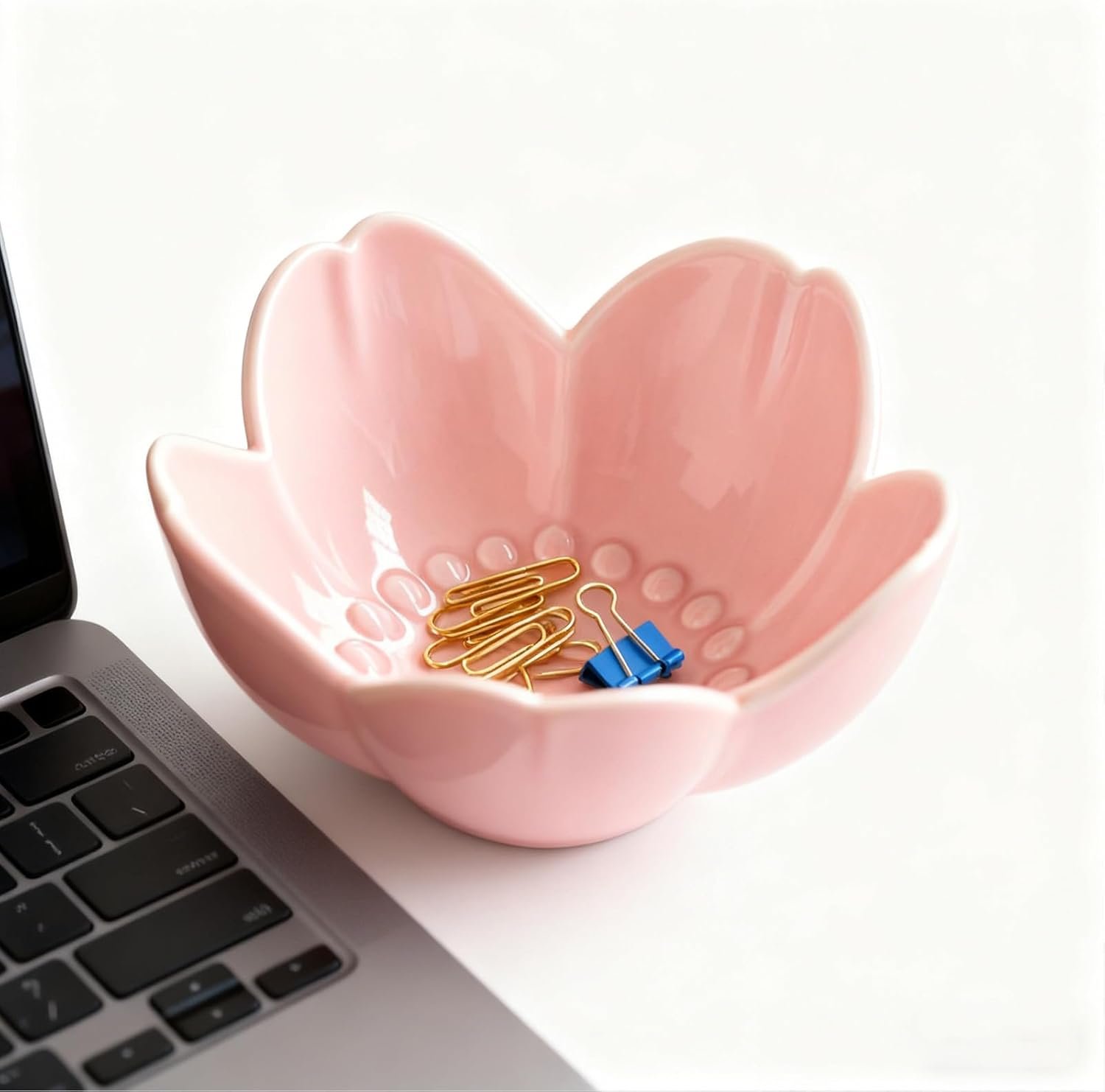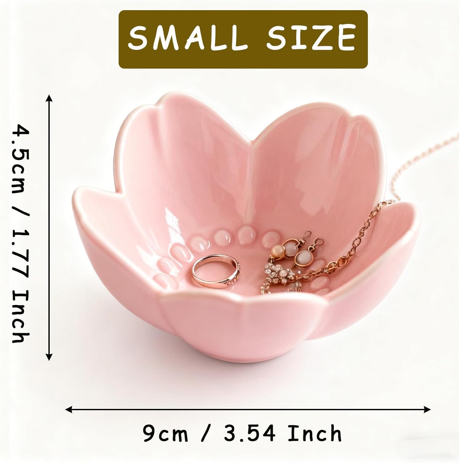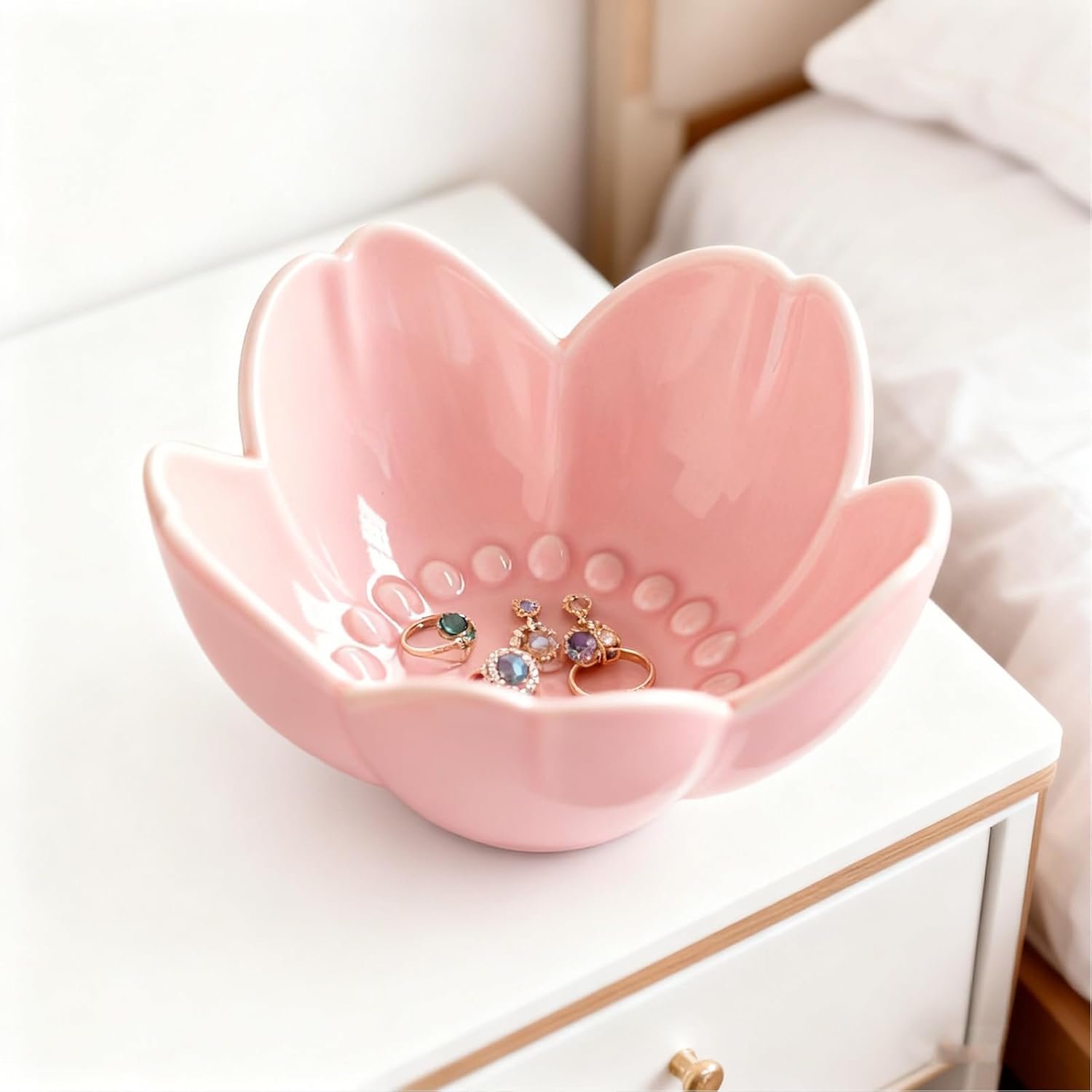 PRACTICAL FUNCTIONALITY RING HOLDER DISH: Ring bowl keeps jewelry organized, visible, and easily accessible while serving as an attractive decorative piece. Trinket dish is the perfect accessory for any dresser, vanity, or sink where jewelry or other small valuables are removed. This jewelry bowl would also make a great small gift for any occasion. The raised petal design prevents jewelry from slipping, and the smooth ceramic glaze won’t scratch your jewelry or tabletops.