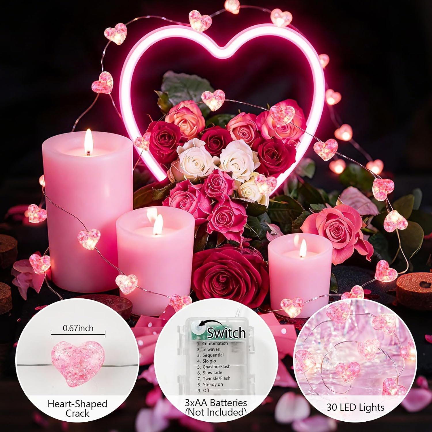 【Waterproof and Portable】: Our pink valentine heart led lights are crafted from high-quality material, soft, bendable copper wire that is very flexible. Both lights and the battery case are waterproof, you can easily carry and set the pink romantic heart string lights anywhere you like; powered by 3 AA batteries (not included), no plug, super easy to use. The Switch is a small white button, on the battery case.