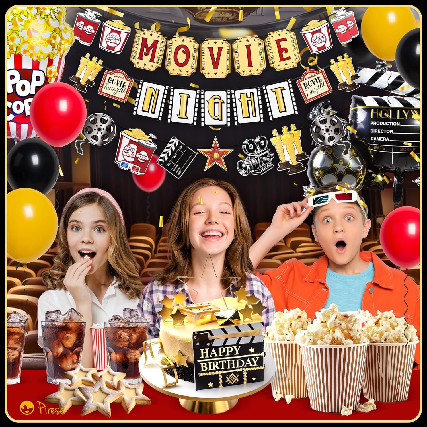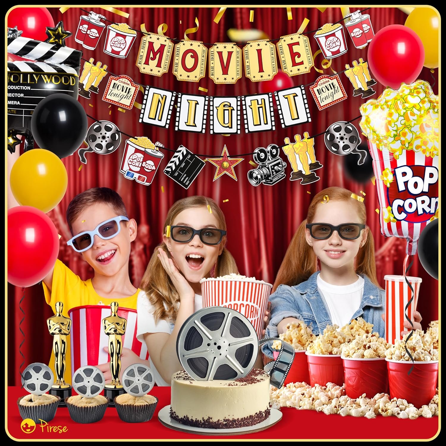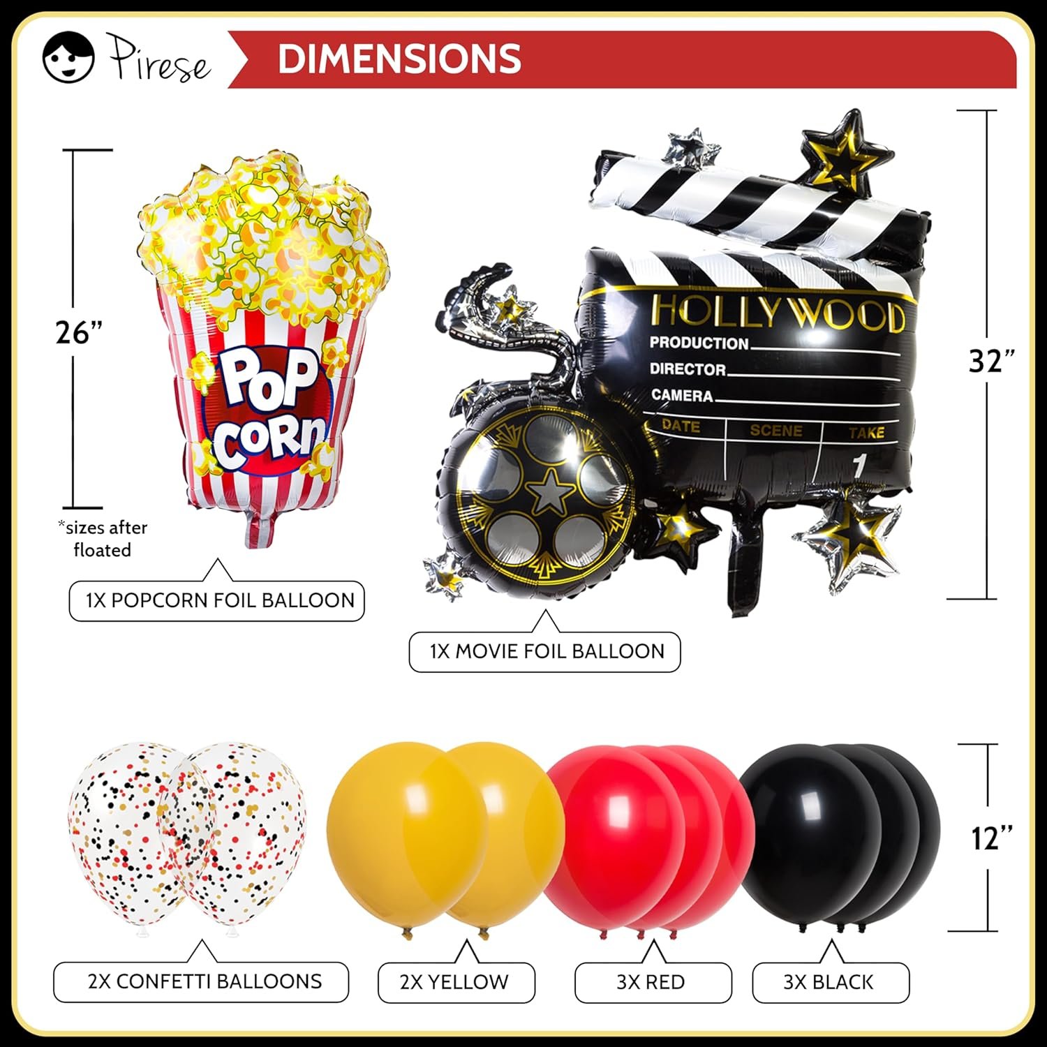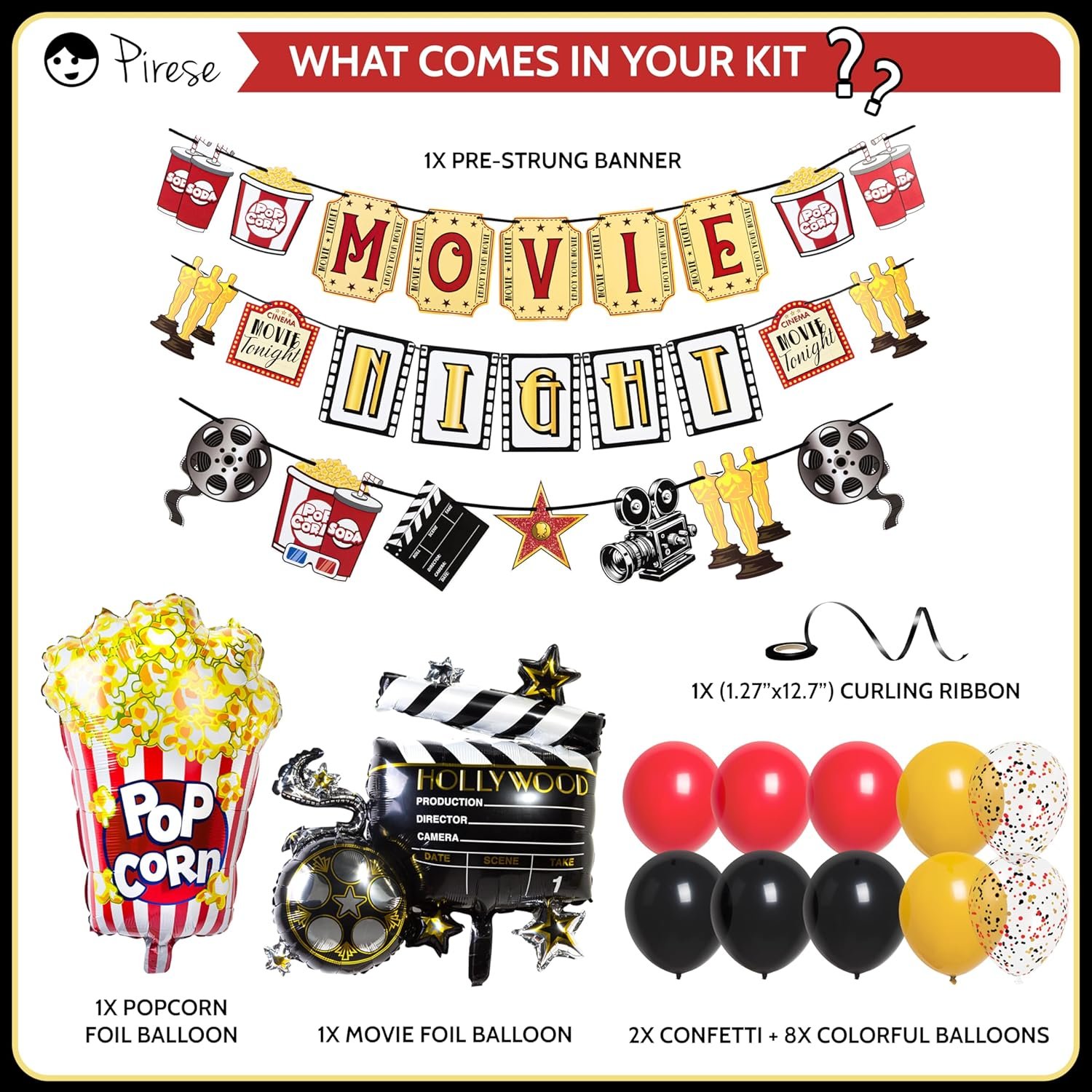 ALL-IN-ONE Decoration Pack: No need to shop around! Our kit includes 1x Movie Night sign 6.6ft, 8x colorful balloons 12″, 2x confetti balloons 12″, 1x popcorn balloon foil (30″) and 1x camera action foil balloon 32″. Full cast of decorations in one package!