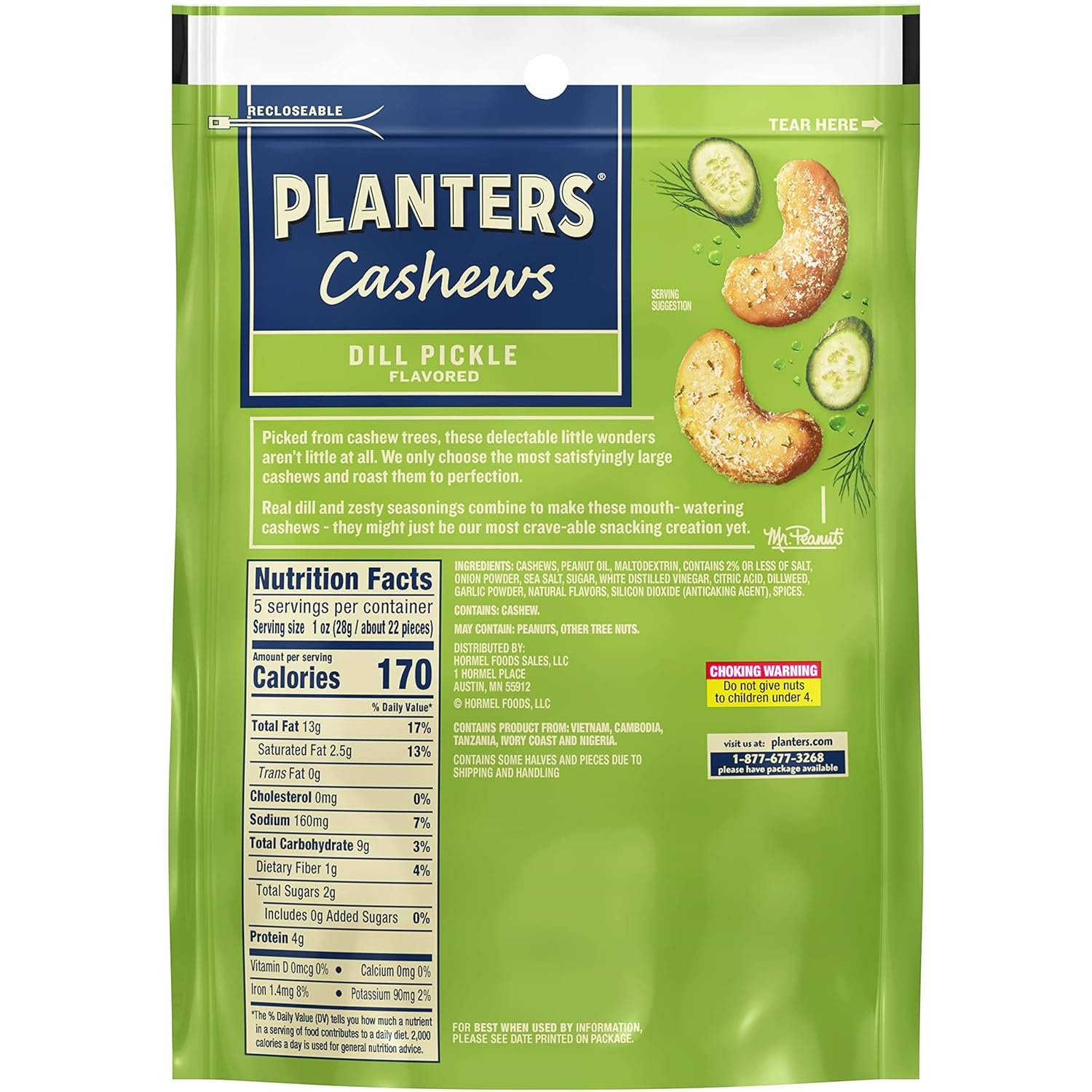 PLANTERS Cashews Dill Pickle provide the perfect blend of sweet and sour for those seeking snacks nuts that also satisfy sweet cravings. These nuts offer a delightful combination of creamy cashews and sour dill, making them a top choice in snacks variety packs for adults. With 4g of plant-based protein and 170 calories per serving, these nuts snacks deliver a boost to help keep you going between meals. Perfect for any occasion, whether it’s a party, a relaxing cocktail hour, or simply a midday break. They are also ideal for road trips or in the office, offering convenience with great taste. Each 5oz bag is carefully packaged for freshness, making them a reliable component of any snacks variety pack. Reach for PLANTERS Cashews Dill Pickle whenever you want a satisfying snack with the convenience of nuts snacks. All trademarks, logos and images are owned by Hormel Foods Corporation, its subsidiaries and affiliates. Copyright Hormel Foods, LLC.