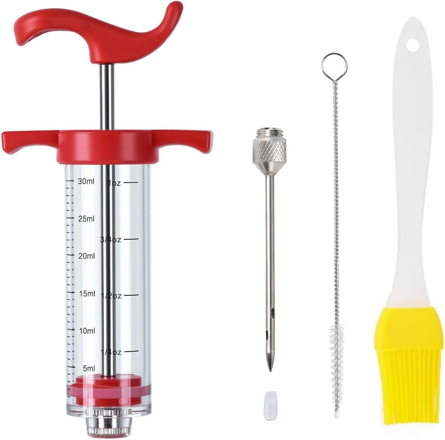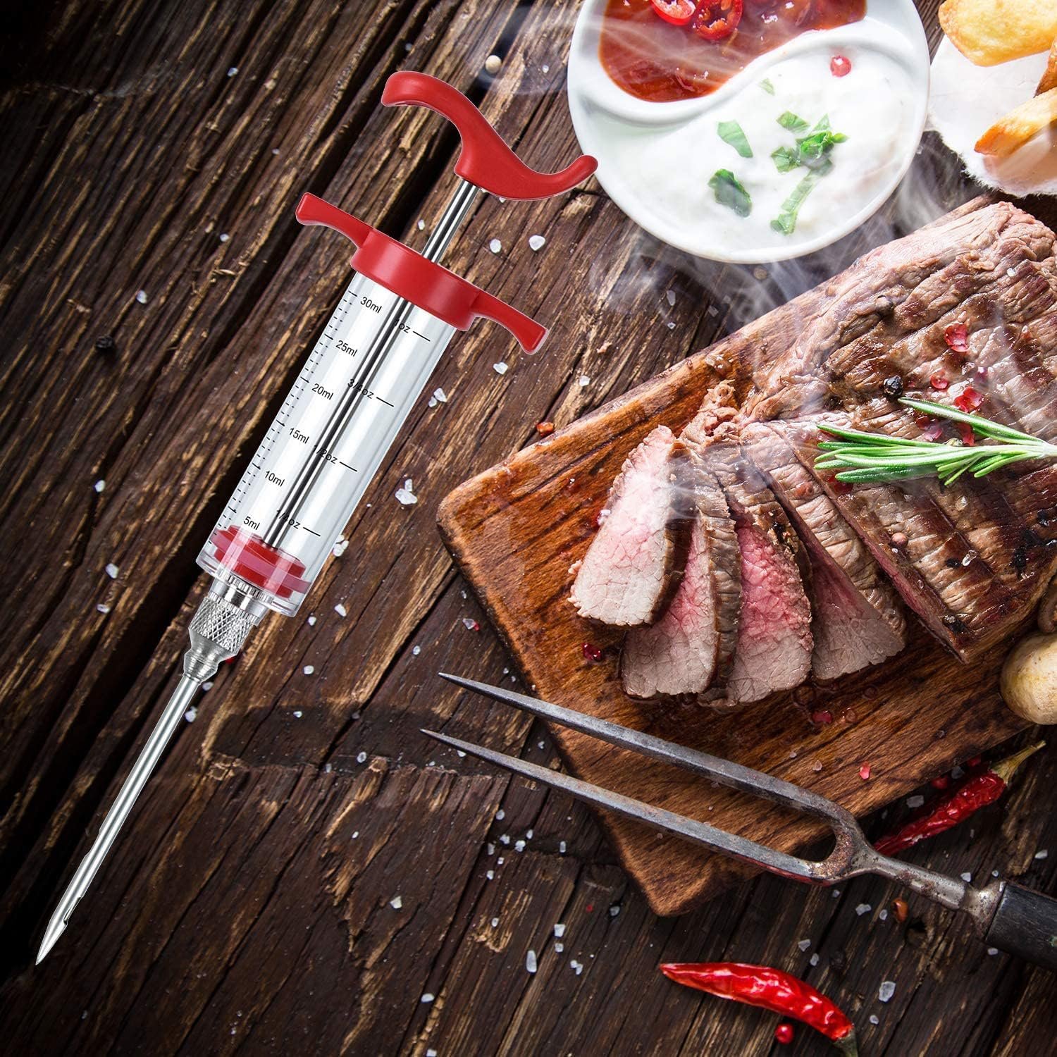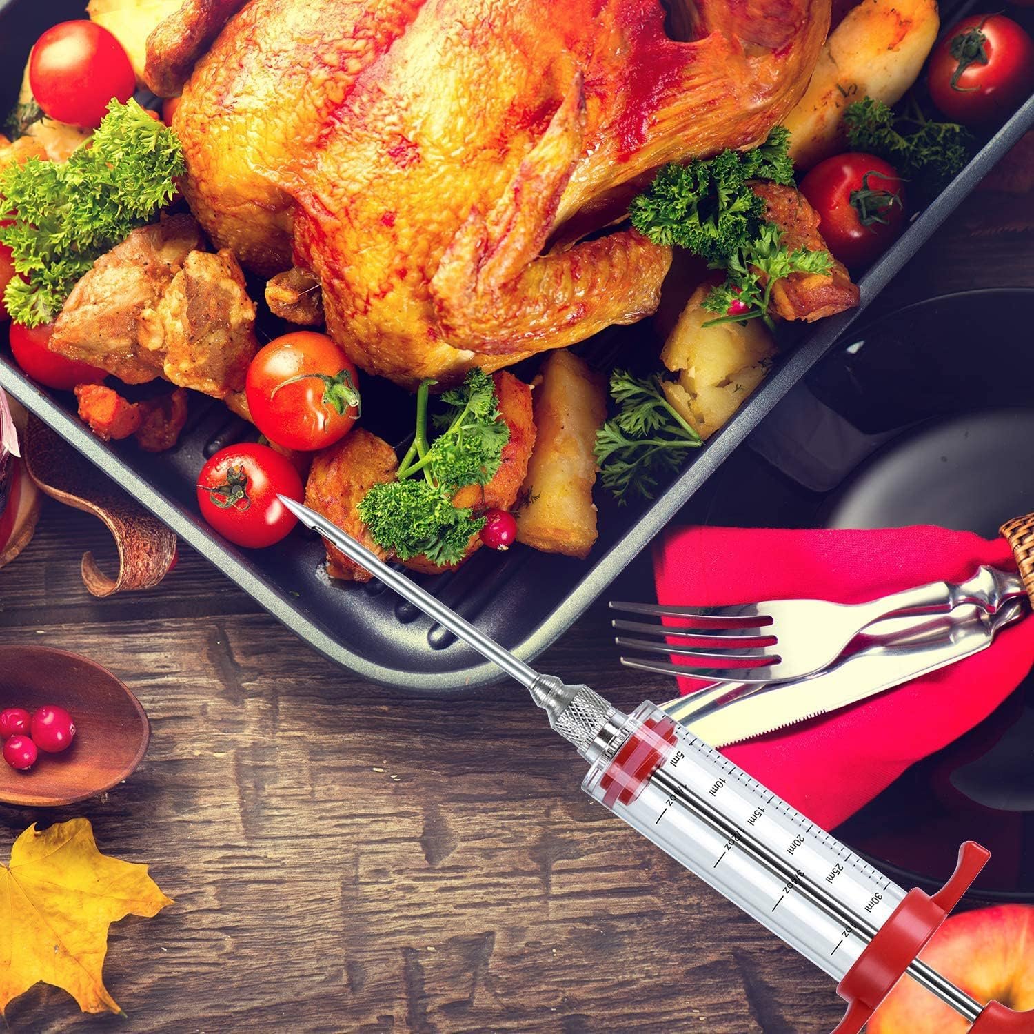 Marking Scale: The plastic turkey injector barrel is marked with a clear scale:1 oz / 30 ml max capacity – so you can inject different doses of meat injector marinade into the food to enhance the flavor. Intensify flavors of Thanksgiving turkey Christmas turkey, beef, pork, chicken and BBQ roaster meat