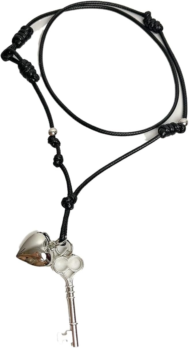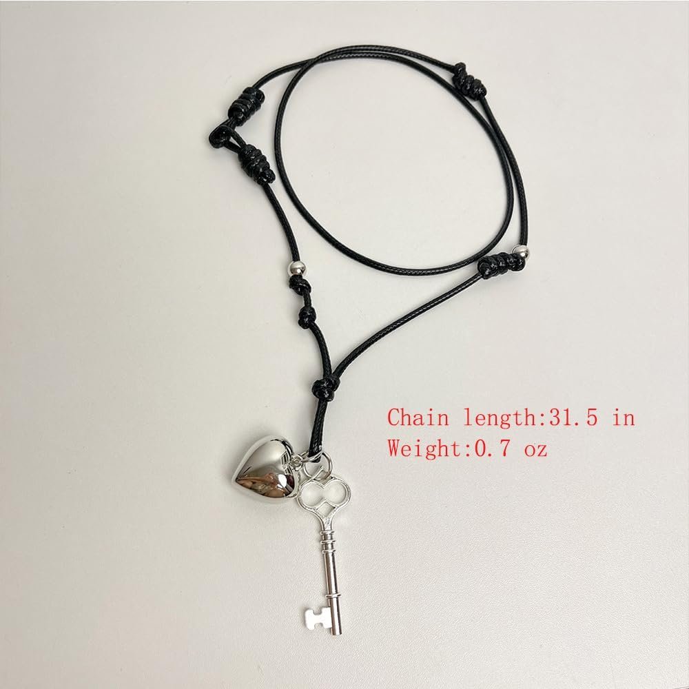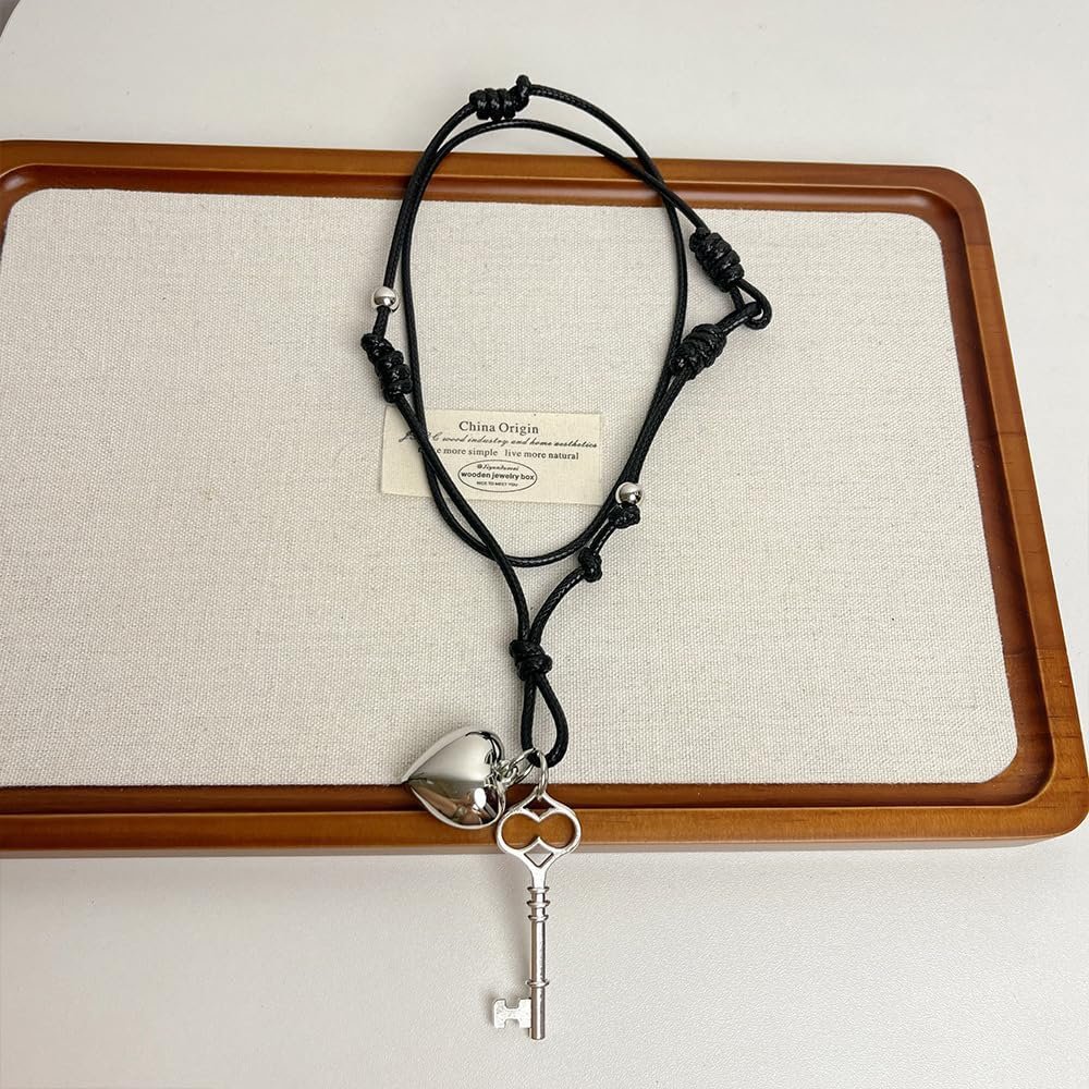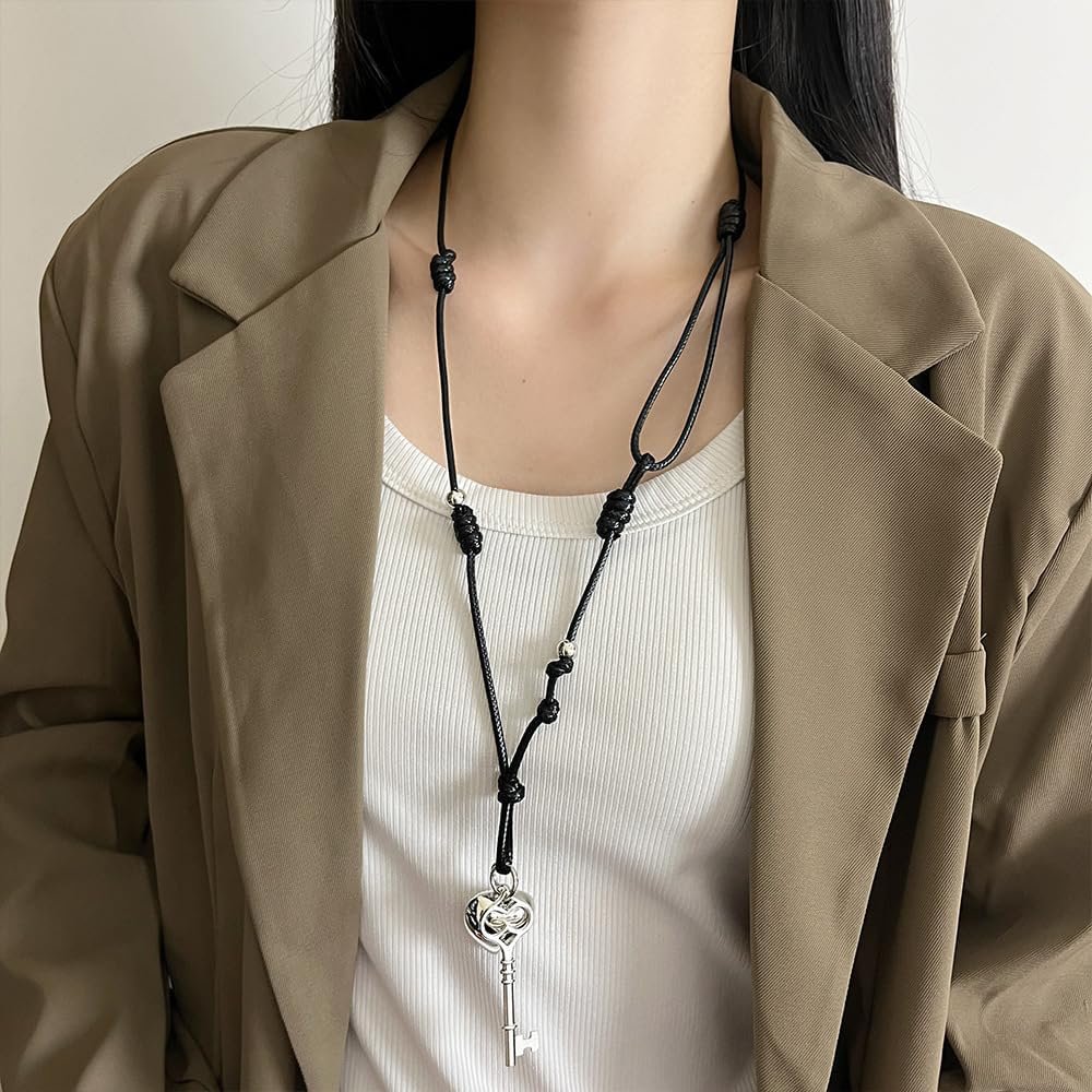 Heart Lock Key Pendant Adjustable Black Rope Lariat Necklace for Women