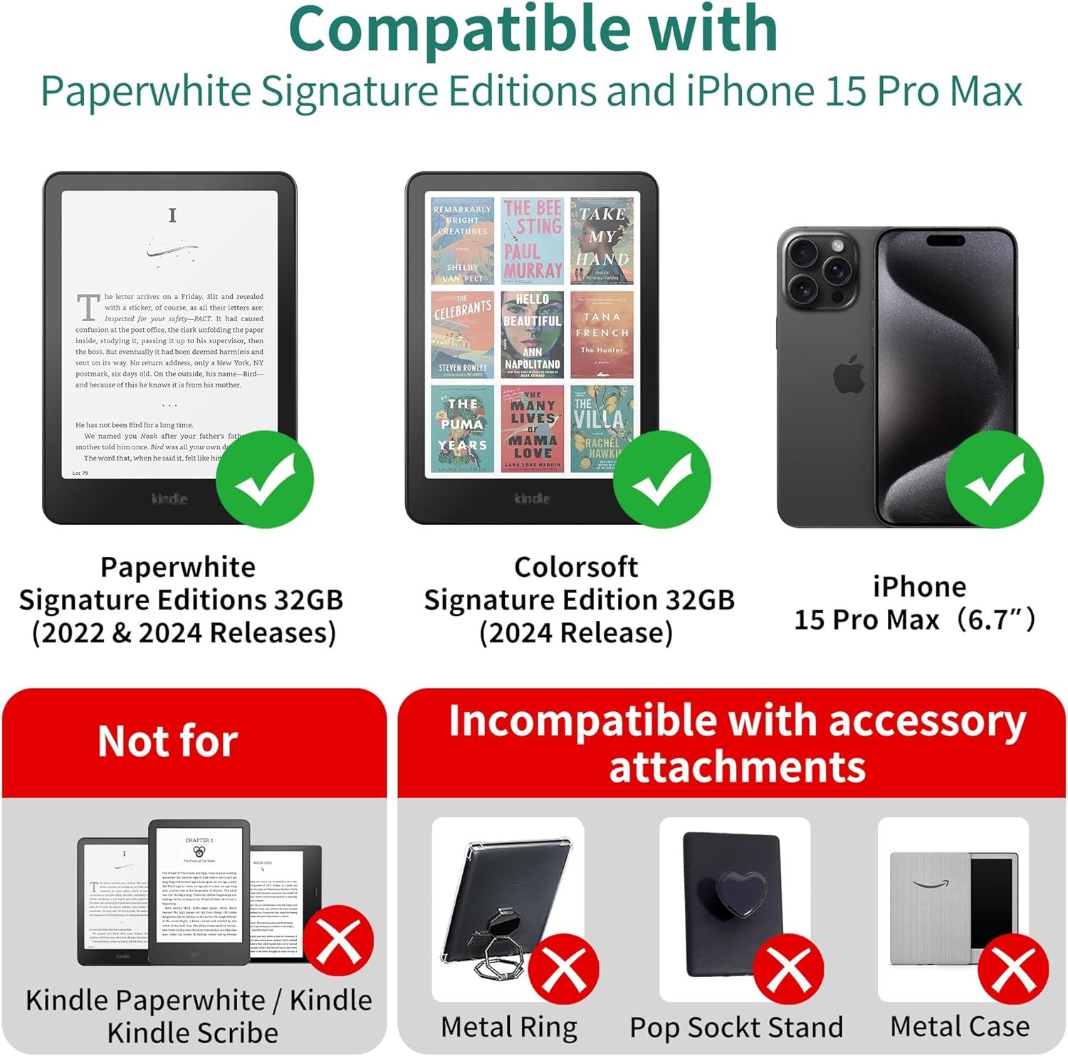 Compatibility: The wireless charging dock is designed for Kindle Paperwhite Signature Edition 32GB (2022 & 2024 Releases) ,for Kindle Colorsoft Signature Edition 32GB and for iPhone 15 Pro Max. Only compatible with the versions that have the “Signature” included in the model. **Not compatible with Kindle 16GB device, such as Paperwhite 16GB (newest model) and Colorsoft 16 GB (newest model) . Please check your device model first**