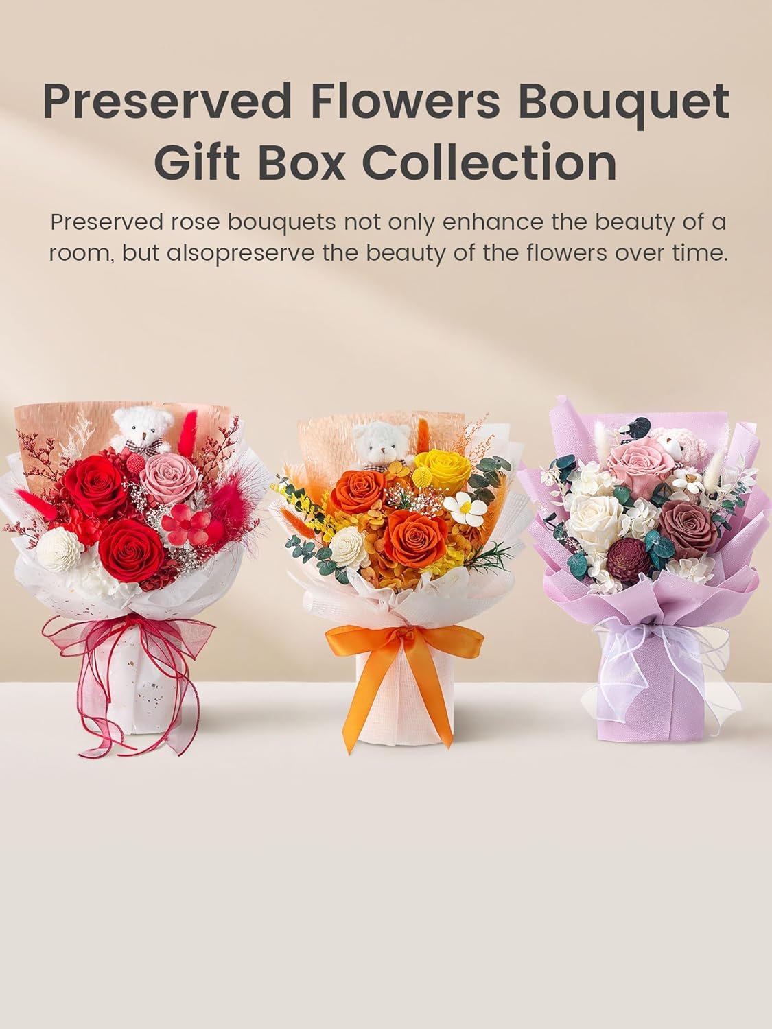 Hand-Made Flowers Bouquet: The flowers bouquets are handcrafted from preserved roses and hydrangeas. A cute bear makes this bouquet more adorable and an ideal gift for loved ones.
