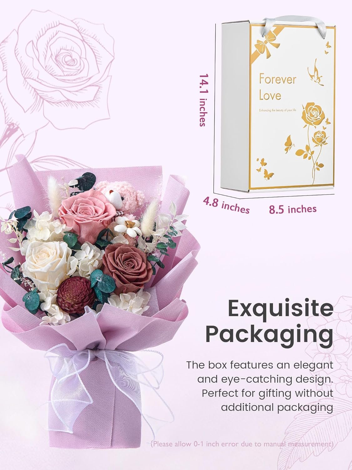 Romantic Gift for Her: This forever flower bouquet is a perfect gift for your loved one on Mother Day, Valentine’s Day, Graduation, Birthday or engagement. With these romantic forever flowers, you can make her day extra special and show her just how much you care.