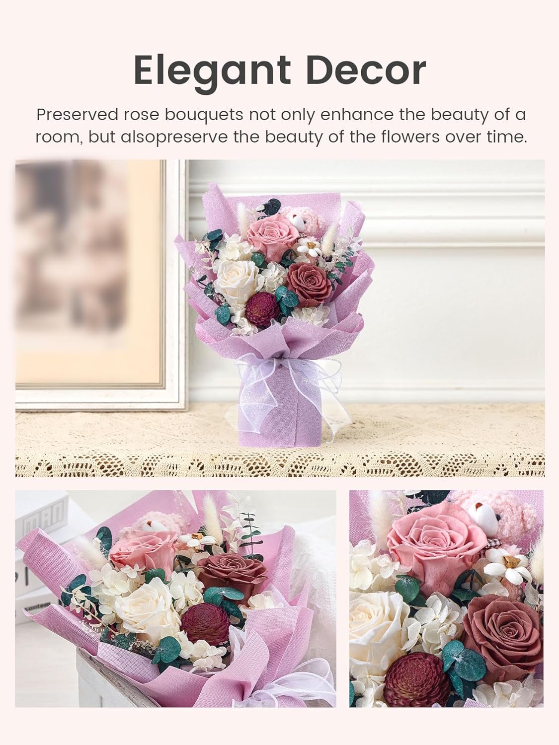 This preserved roses bouquet is an ideal gift for your wife, mother, grandma, girlfriend or significant other.