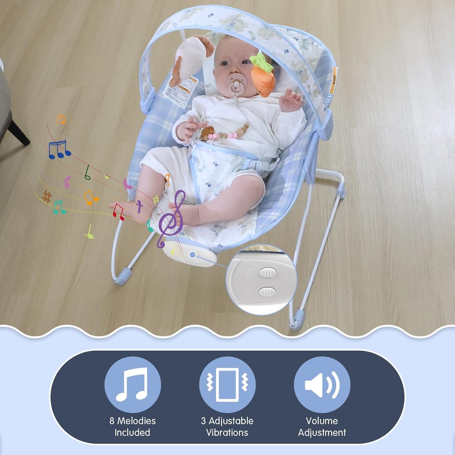 【Soothing Melodies & Adjustable Vibrations】This baby bouncer features 8 gentle melodies, 3 adjustable vibration levels, and volume control. Create a calm, customized space for your baby to relax or play. The combination of soft bouncing motion and relaxing sounds helps soothe fussy infants and frees up your hands.