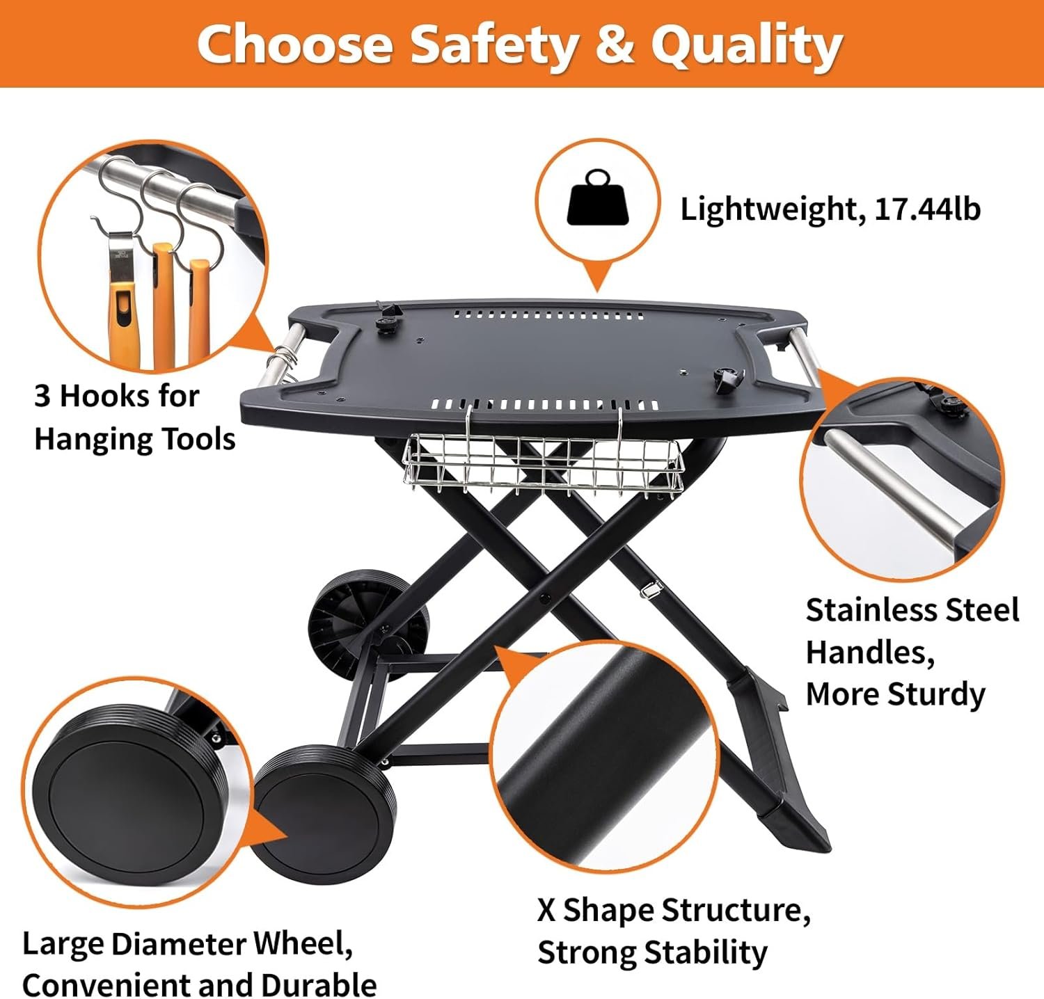 【Unique Design】Your grill is too heavy to carry? Two durable wheels help to take your grill anywhere you want, especially convenient during outside. The folding cart makes it easier to storage when you are not using it, save your space a lot. The ‘X’ shape provide more stability to cart as well. Find a ground, open your cart, enjoy your BBQ time now!