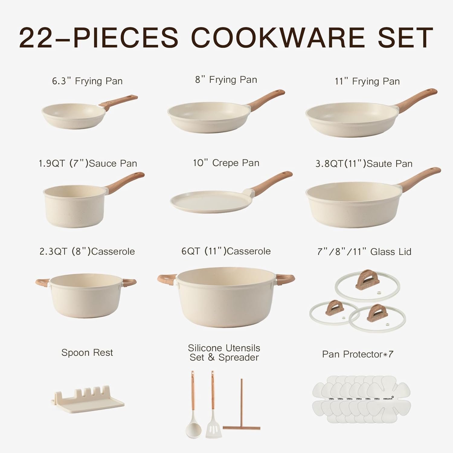 COMPLETE SET: 22-Piece Cookware Set Includes frying pans (6.3”, 8”, 11”), saucepans (1.9QT, 3.8QT), casseroles (2.3QT, 6QT), 10 Crape Pan, glass lids, silicone utensils, spoon rest & 7 pan protectors.