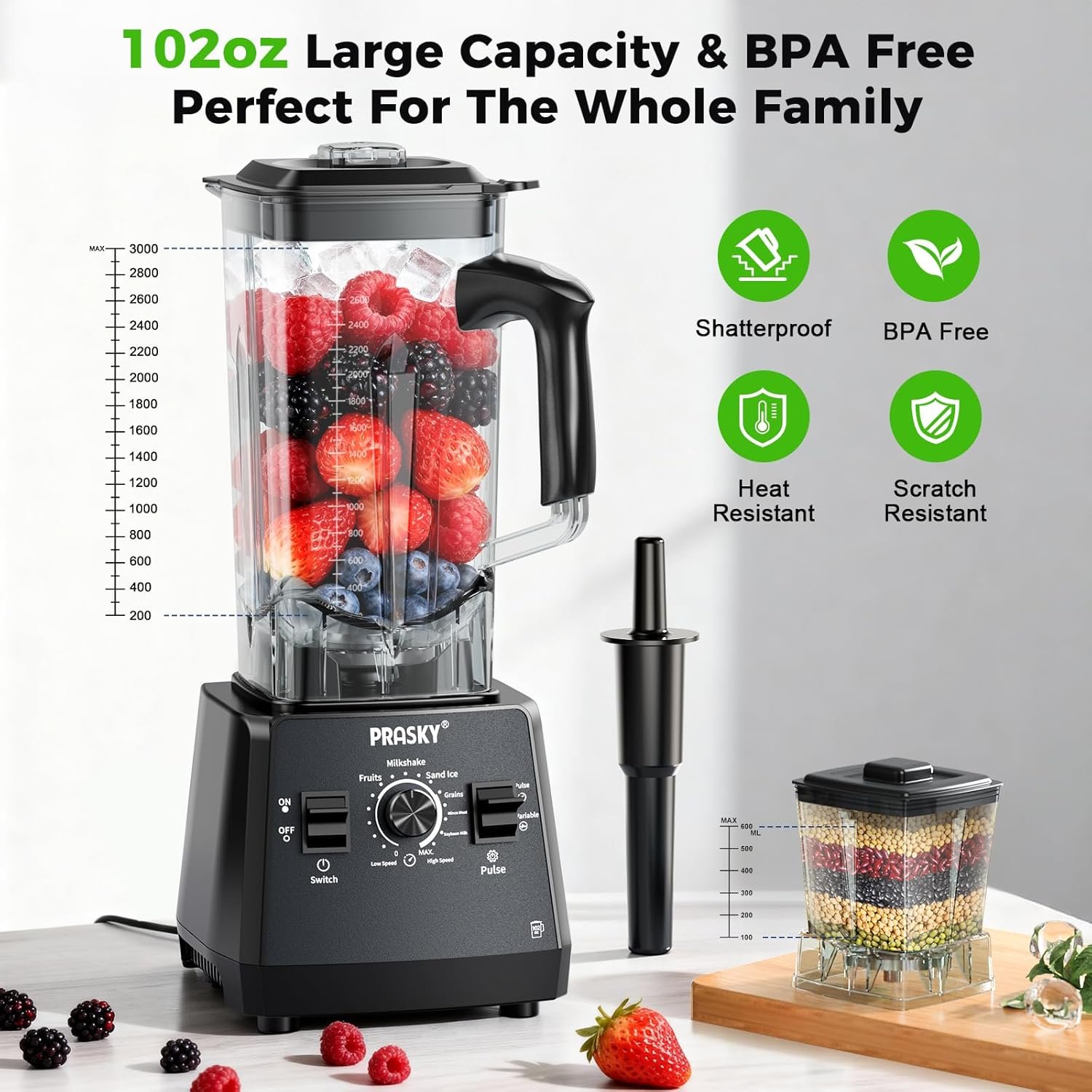 Striving to create high-performance blenders, PRASKY is constantly upgrading and improving. With a generous 3L capacity, it becomes a perfect partner for family kitchen — powerful, reliable, and efficient. No more concerns about meal preparation, all about health and convenience for everyone.