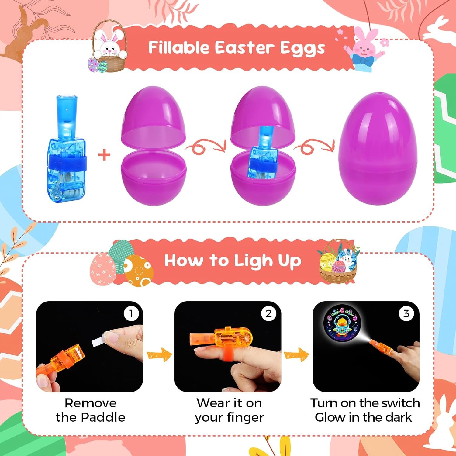 Long-Lasting Glow: Each finger light is equipped with an insulating sheet, keeping them glowing brightly all night long for nighttime Easter egg hunts and outdoor activities. These glow-in-the-dark Easter egg toys offer high visibility in dark spaces, far outshining traditional candy fillers. As a great non-candy alternative for Easter, they bring endless fun to kids, making them the creative glowing toys for the whole Easter celebration.