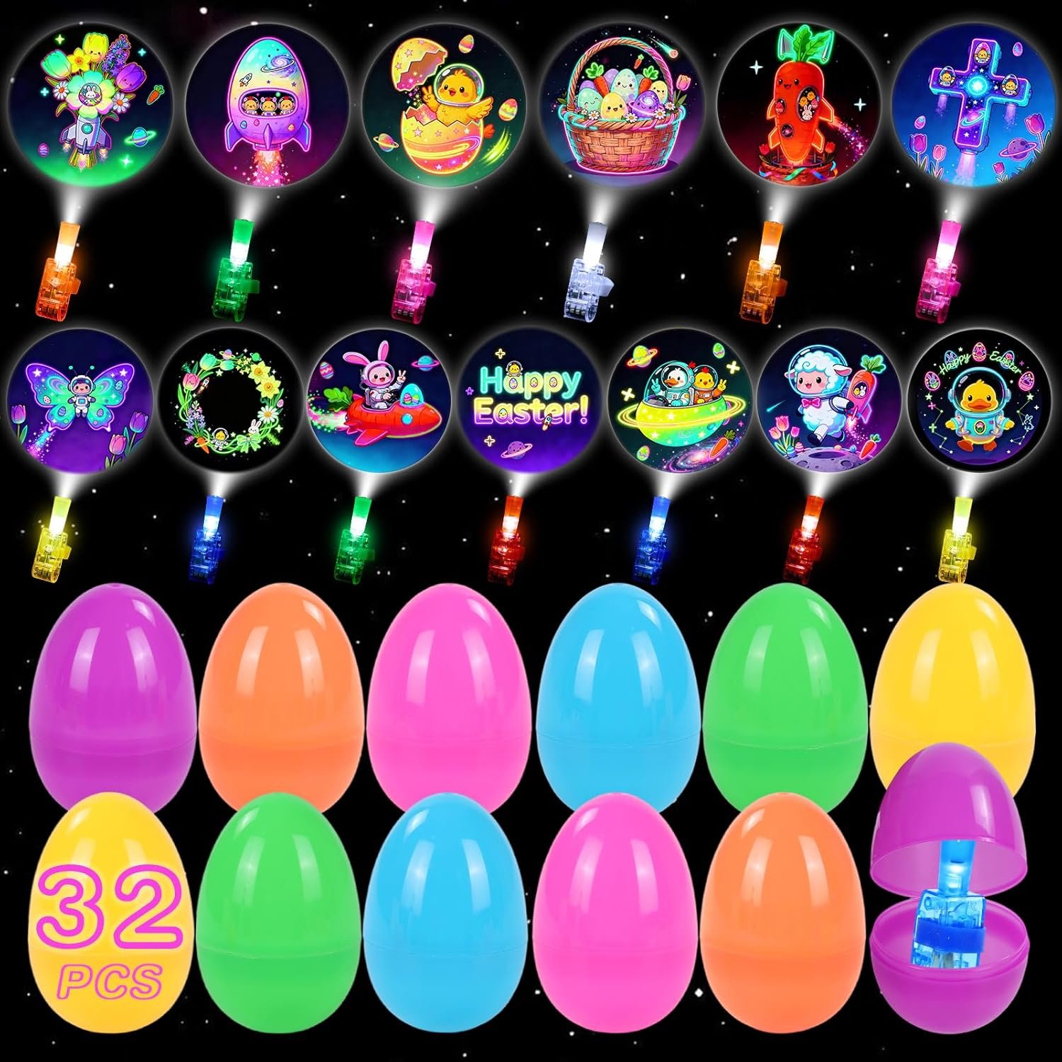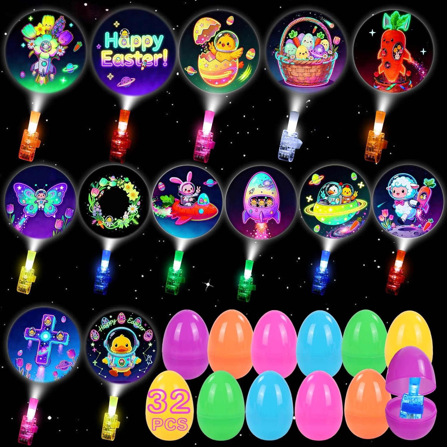Fun Easter Space Patterns: 32 neon glowing finger lights feature 13 unique patterns that mix classic Easter elements and cosmic space themes, including bunnies, carrots, hatching eggs,Easter baskets and “Happy Easter” lettering, and more. With clear glowing lines, these creative Easter finger lights glow brightly in the dark, sparking kids’ imagination and making Easter egg hunts extra fun for boys and girls aged 5-12. These make great Easter egg fillers.