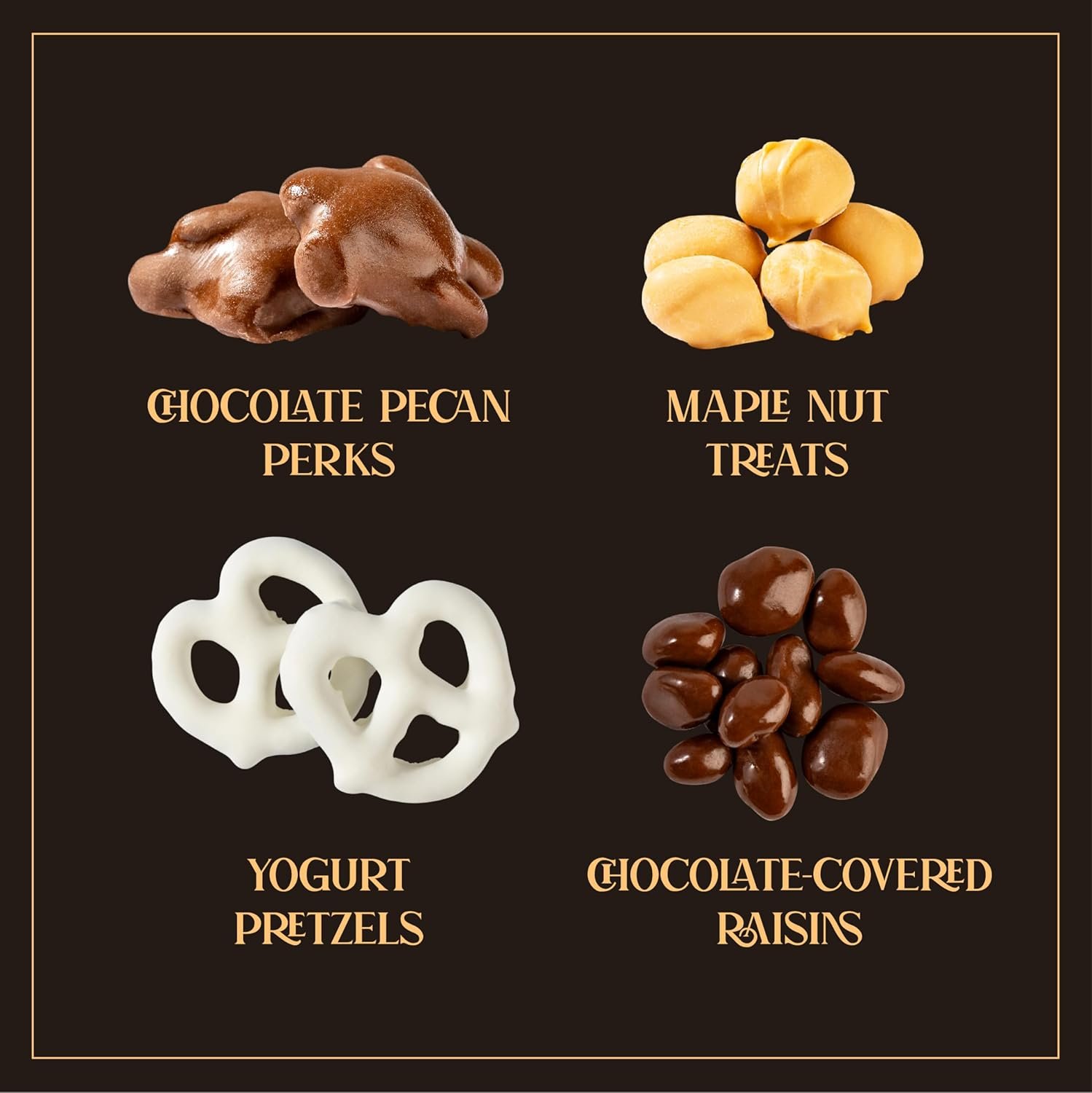 Delicious Variety of Gourmet Treats – Indulge in a delightful assortment including Chocolate Pecan Perks, Maple Nut Treats, Yogurt-Covered Pretzels, and Chocolate-Covered Raisins, perfect for any sweet tooth.
