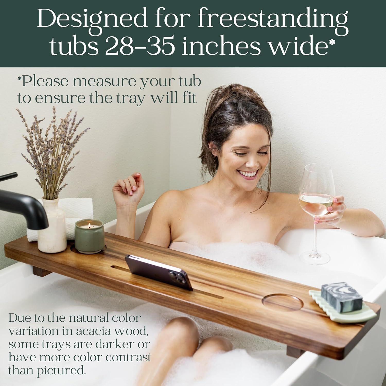 MAKE SURE TO MEASURE YOUR TUB to ensure this 35-inch-wide tray is workable for your bathtub. This bath caddy fits most freestanding bathtubs and is large and thick at 35” wide x 9” deep x 2.5” high. The legs underneath the tray have three width options to protect from accidental bumps or tipping. The pre-drilled and reinforced width options for the legs are 23”, 25.5”, and 28” apart.
