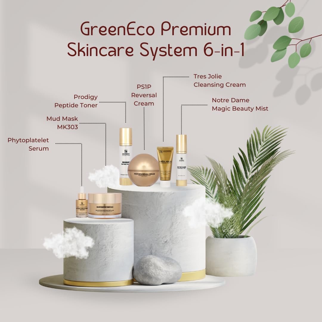 Complete 6-in-1 Skincare Regimen – Includes Tres Jolie Cleansing Cream, Mud Mask MK303, Phytoplatelet Serum, PS1P Reversal Cream, Prodigy Peptide Toner, and Notre Dame Beauty Mist for a full daily skincare solution.